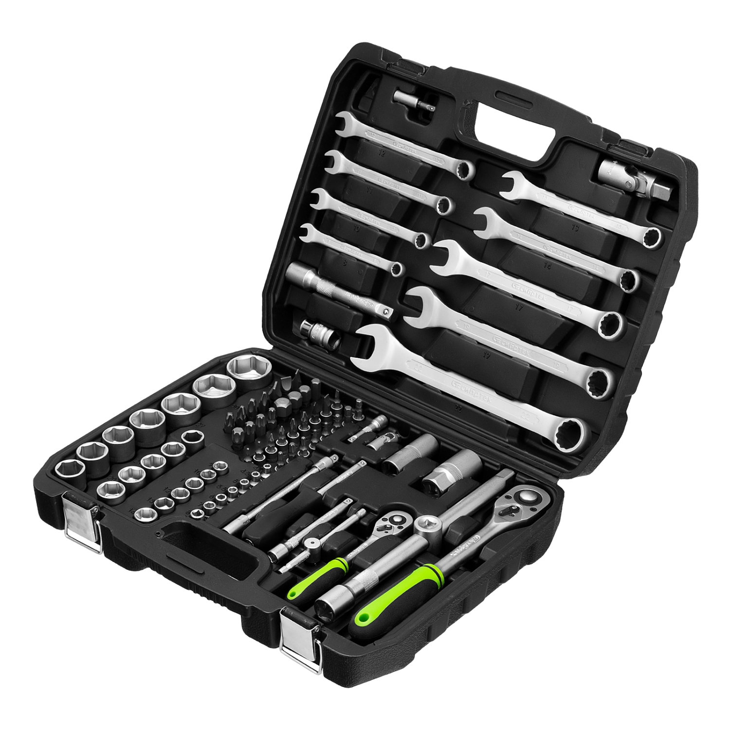 Набор инструмента Сибртех 13500, состоящий из 83 предметов с присоединительными размерами 1/2"" и 1/4"", предназначен для ремонта и обслуживания автомобилей, также пригодится в быту. Имеющиеся в комплекте насадки рассчитаны на крепеж с различными типами профилей и шлицев, включая HEX и TORX. Набор будет полезен профессиональным мастерам и автолюбителям.Надежность и долговечность — все элементы набора изготовлены из высокопрочной инструментальной стали и выдерживают активное использование.