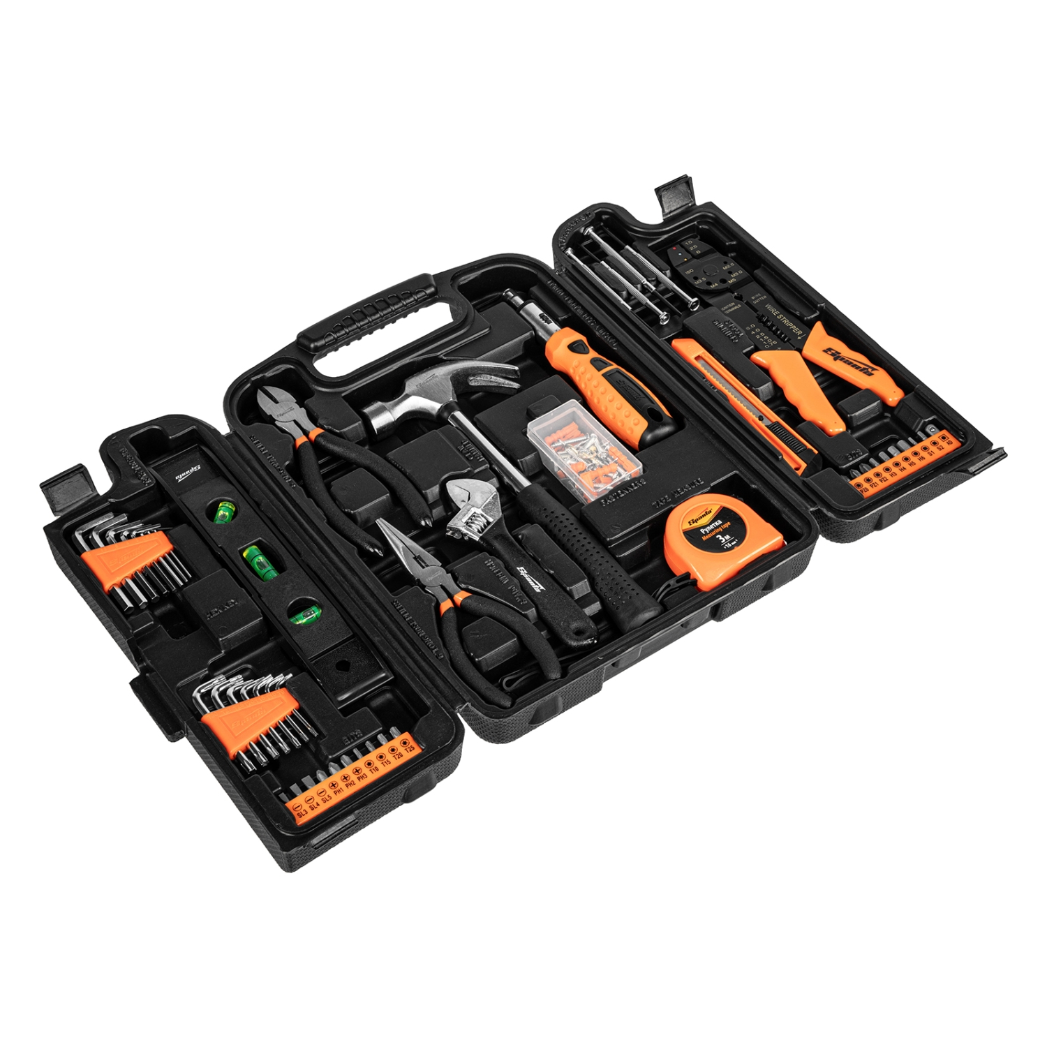 Набор инструментов Sparta 135645 включает в себя 132 предмета для бытового применения: обжимные клещи, отвертки, в том числе для точных работ, молоток-гвоздодер, бокорезы, строительный уровень, разводной и имбусовые ключи, биты-вставки с адаптером, длинногубцы, рулетку, канцелярский нож, а также набор крепежа. Инструменты оптимально подходят для выполнения слесарно-монтажных работ дома или на даче.