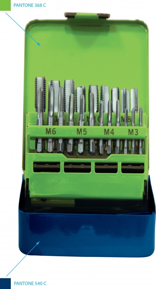 Метчики помещены в гнезда с маркировкой размера, что обеспечивает быстрый поиск нужного инструмента.