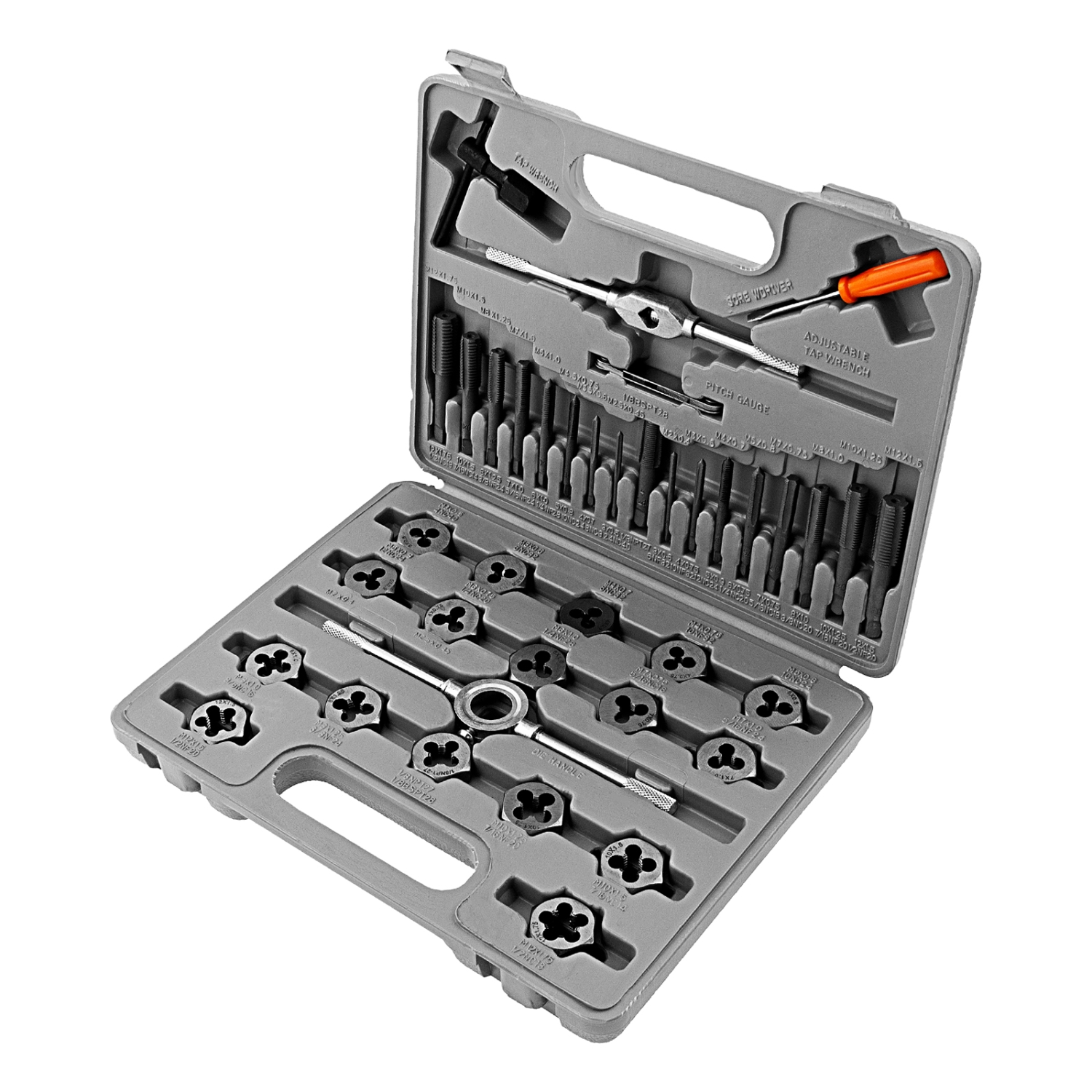 Набор метчиков и плашек М3-М12 Sparta 773155 из 40 предметов, с плашко- и метчикодержателем, в пластиковом боксе, используется для нарезания внешней и внутренней резьбы разного размера. Позволяет работать как с глухими, так и со сквозными отверстиями. Набор будет полезен при выполнении ремонтных работ, подойдет для домашнего применения. Резьбонарезные инструменты изготовлены из быстрорежущей стали, поэтому подходят для работы с металлами повышенной прочности.
