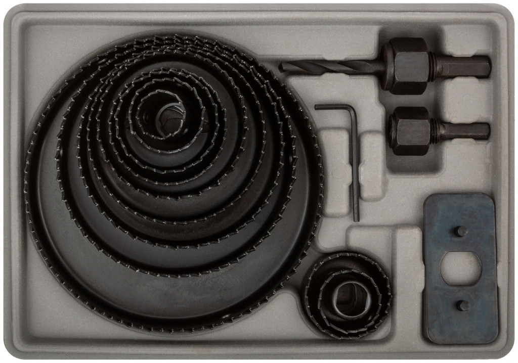Пилы круговые 19-127 мм для высверливания отверстий в древесине твердых и мягких пород, ДСП и фанере. В наборе 12 пил круговых: 19, 22, 28, 32, 38, 44, 51, 64, 76, 89, 102 и