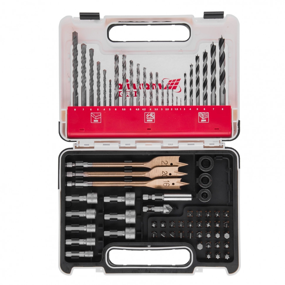 Комбинированный набор Matrix PRO 725671 — это универсальное решение для мастеров, т.к. он содержит 71 предмет: шестигранный ключ, зенкер, отверточные биты (30 шт.) и адаптер к ним, 8 торцевых головок, 3 перовых сверла, сверла по дереву 3-8 мм, сверла по бетону 3-8 мм и сверла металлу 1-6 мм. Оснастка соответствует высоким стандартам качества, поэтому рассчитана как на использование в быту, так и на решение профессиональных задач. Качественное исполнение деталей набора гарантирует их высокий ресурс: адаптер и торцевые головки выполнен из стали CrV, перовые сверла из углеродистой стали, сверла по металлу из стали Р6М5, а сверла по дереву — из стали 45. Сверла по бетону характеризуются долговечностью и износостойкостью, т.к. изготовлены из стали 40Х и имеют твердосплавную пластину ВК8. Биты из прочной стали CrV имеют высокий ресурс и стойкость к коррозии. Благодаря цилиндрическим хвостовикам сверла подходят для большинства дрелей и шуруповертов. Магнитный адаптер позволяет легко и быстро менять биты.