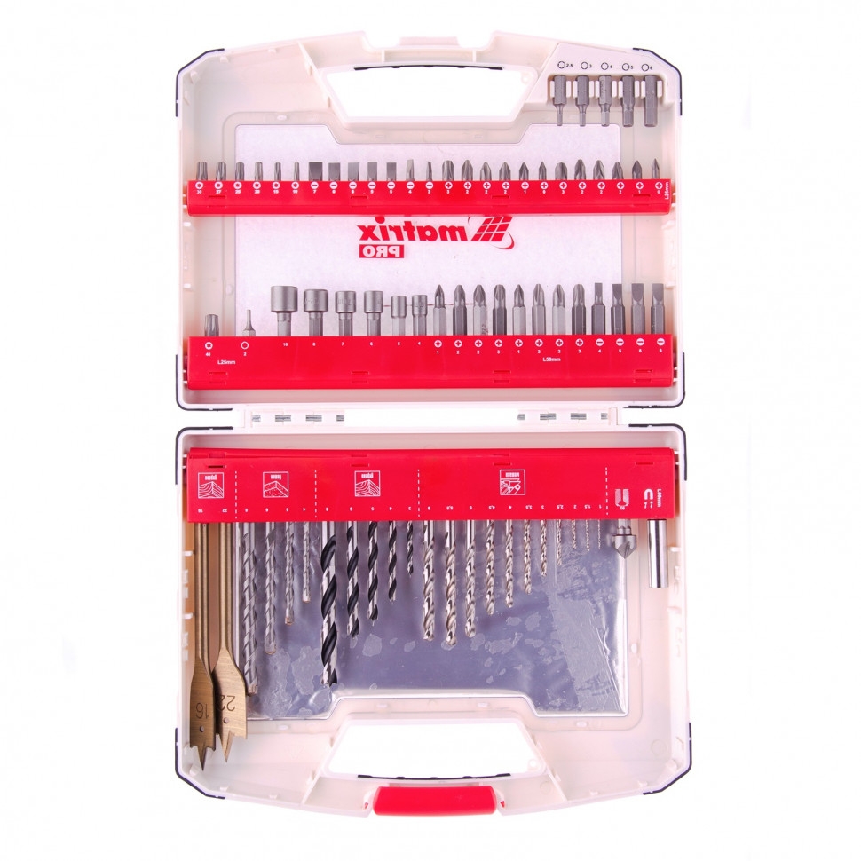 Комбинированный набор Matrix PRO 725675 — это универсальное решение для мастеров, т.к. он содержит 75 предметов: измерительную шкалу, отверточные биты (32 шт.) и адаптер к ним, зенкер, 6 торцевых головок, 2 перовых сверла, сверла по дереву 3-8 мм, сверла по бетону 4-8 мм и сверла металлу 1-6 мм. Оснастка соответствует высоким стандартам качества, поэтому рассчитана как на использование в быту, так и на решение профессиональных задач. Качественное исполнение деталей набора гарантирует их высокий ресурс: адаптер и торцевые головки выполнен из стали CrV, перовые сверла из углеродистой стали, сверла по металлу из стали Р6М5, а сверла по дереву — из стали 45. Сверла по бетону характеризуются долговечностью и износостойкостью, т.к. изготовлены из стали 40Х и имеют твердосплавную пластину ВК8. Биты из прочной стали CrV имеют высокий ресурс и стойкость к коррозии. Благодаря цилиндрическим хвостовикам сверла подходят для большинства дрелей и шуруповертов. Магнитный адаптер позволяет легко и быстро менять биты.