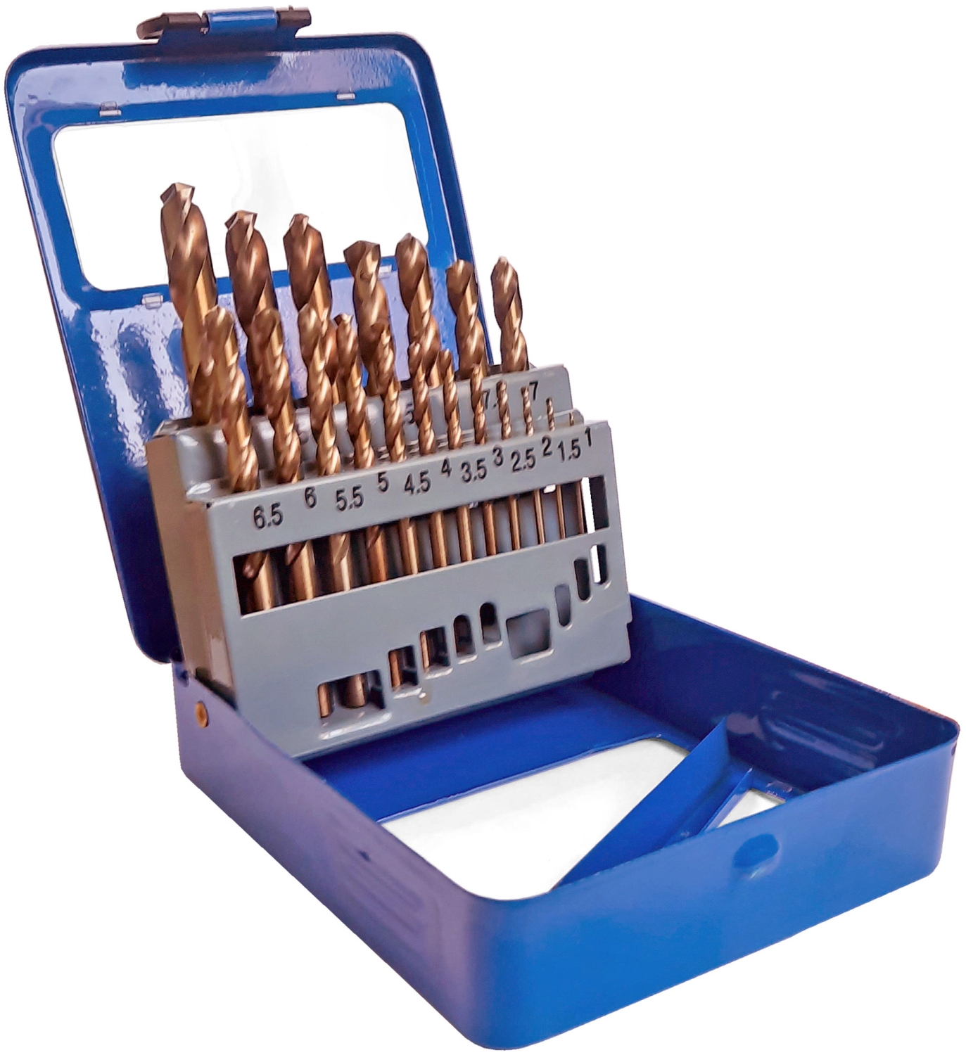 Набор сверл по металлу с кобальтом 5% в металлической коробке; 1-10 мм (через 0,5 мм), 19 шт. Упаковка: металлический бокс для профессионального использования. Класс точности А1. Цилиндрический хвостовик. Угол заточки 135 градусов. Предназначено для сверления отверстий в углеродистых и легированных сталях, серых и ковких чугунах, цветных металлах и пластике. Материал: быстрорежущая HSS сталь c добавлением кобальта 5% (P6M5K5).