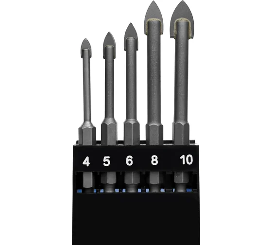 НАБОР СВЕРЛ ПО СТЕКЛУ 0088-5 VERTEXTOOLS - предназначен для получения отверстий в изделиях из стекла и керамики с использованием шуруповерта или дрели.