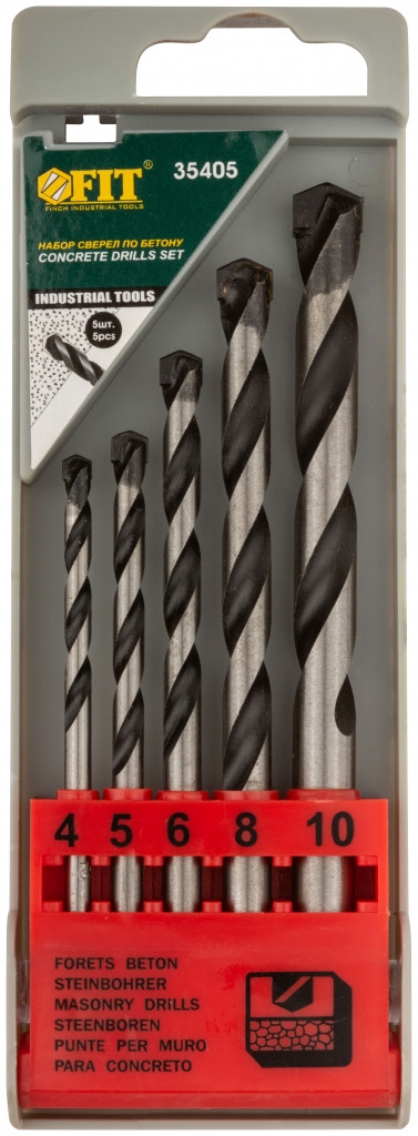 Набор сверл победитовых ударных (для крепкого бетона, камня, кирпича) Профи, цилиндрический хвостовик, 5 шт. (4-5-6-8-10 мм). Для крепкого бетона, камня и кирпича. Для профессионального использования. Материал: инструментальная сталь с твердосплавной вставкой. Набор в пластиковом боксе.