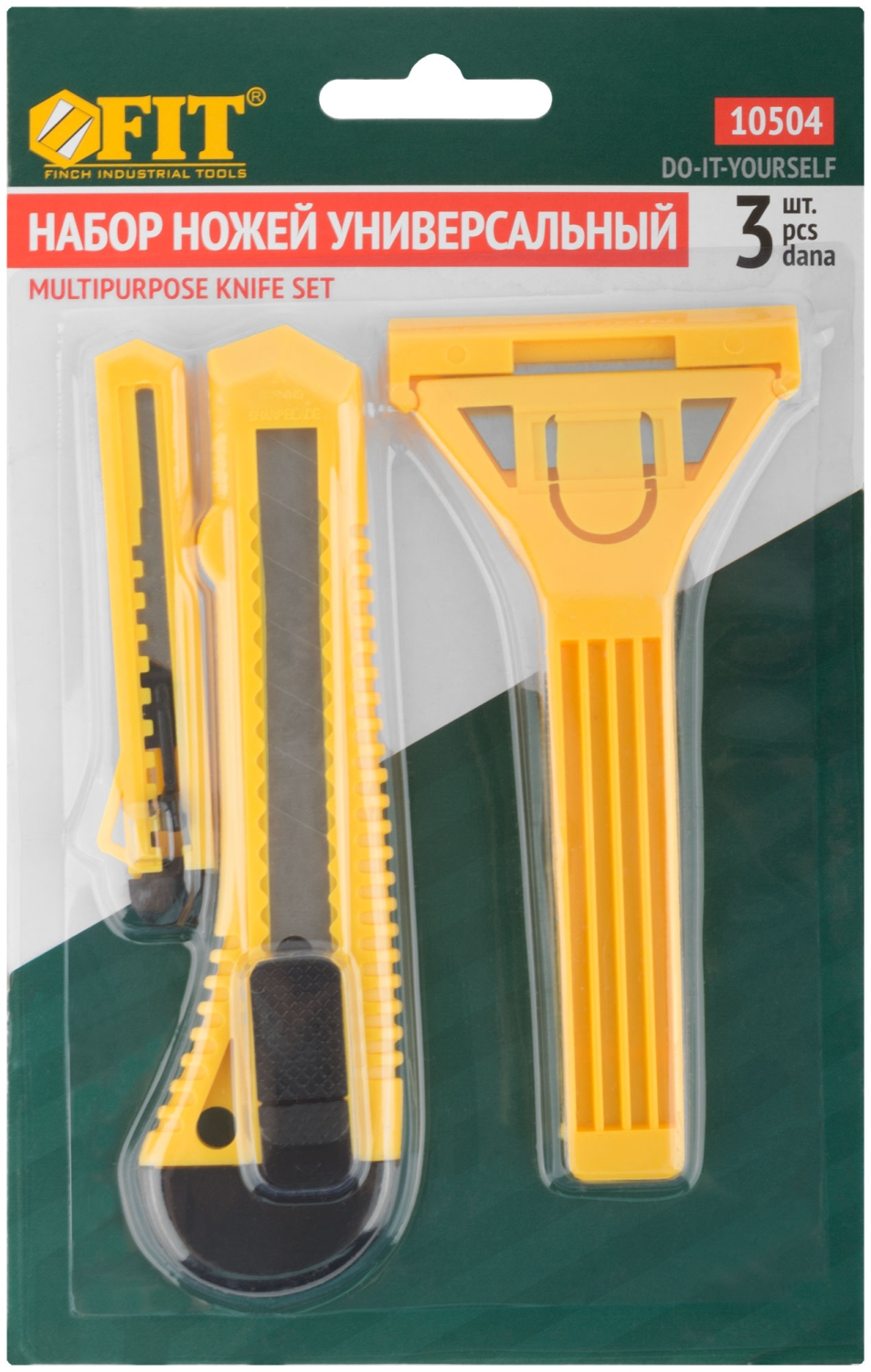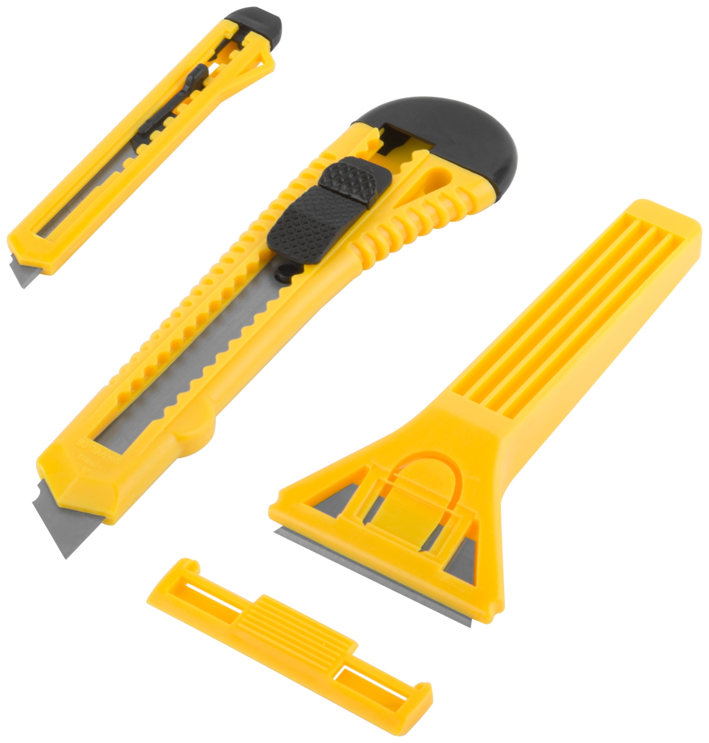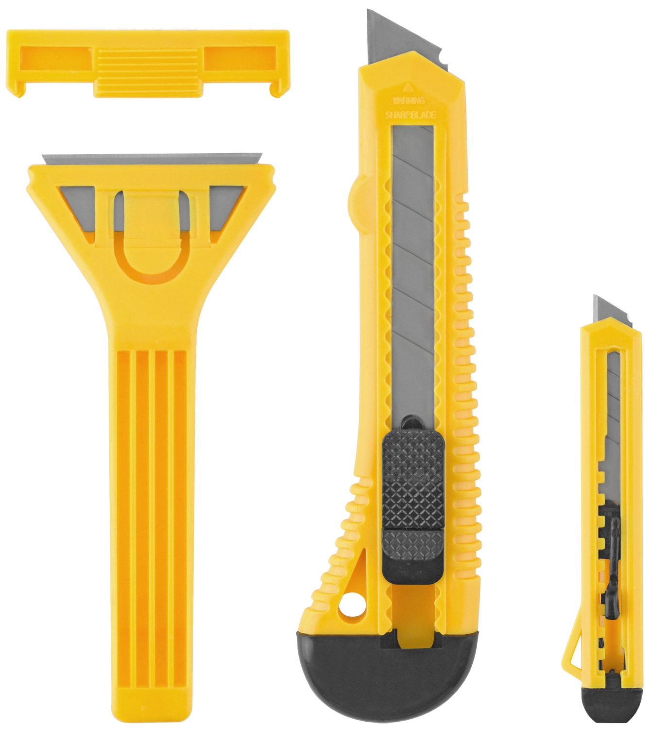 Набор универсальный. Для мелкого ремонта, резки различных материалов, а также для удаления краски и грязи со стекла, кафеля и керамики. В наборе: скребок стекольный, нож технический 18 мм, нож технический 9 мм. Материал: инструментальная сталь, пластик. Упаковка: блистер.
