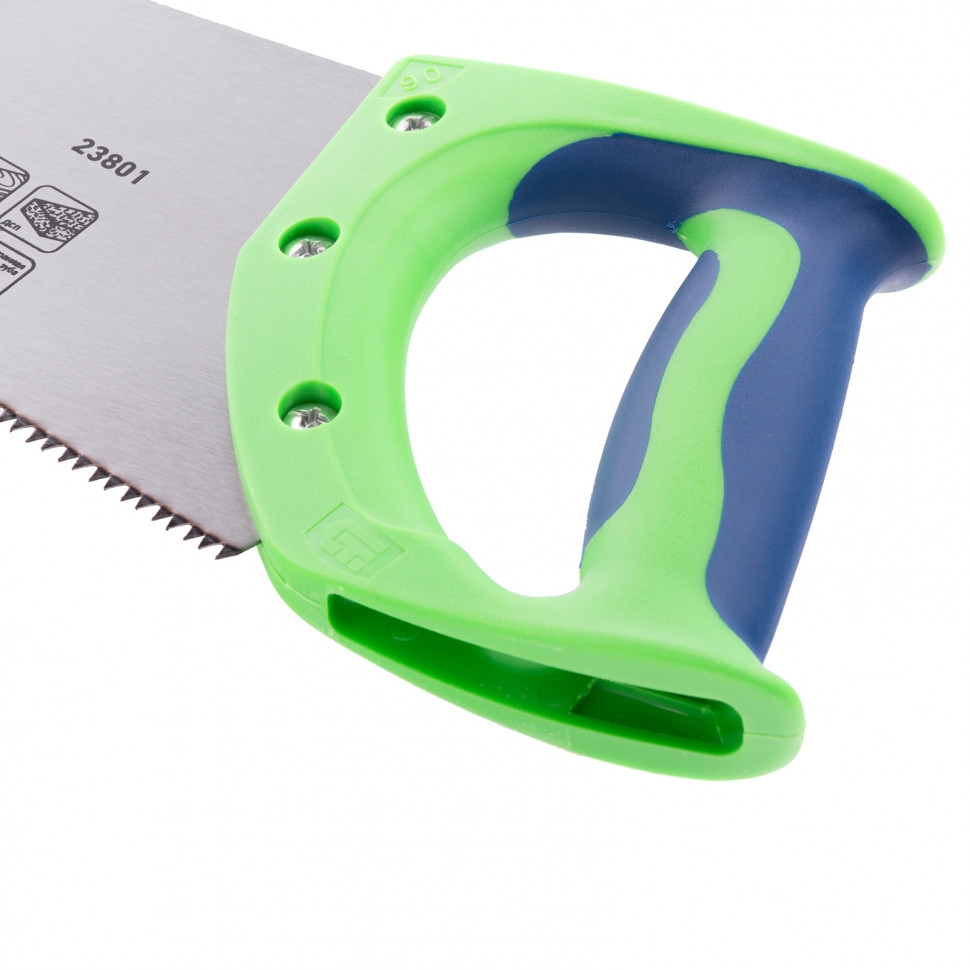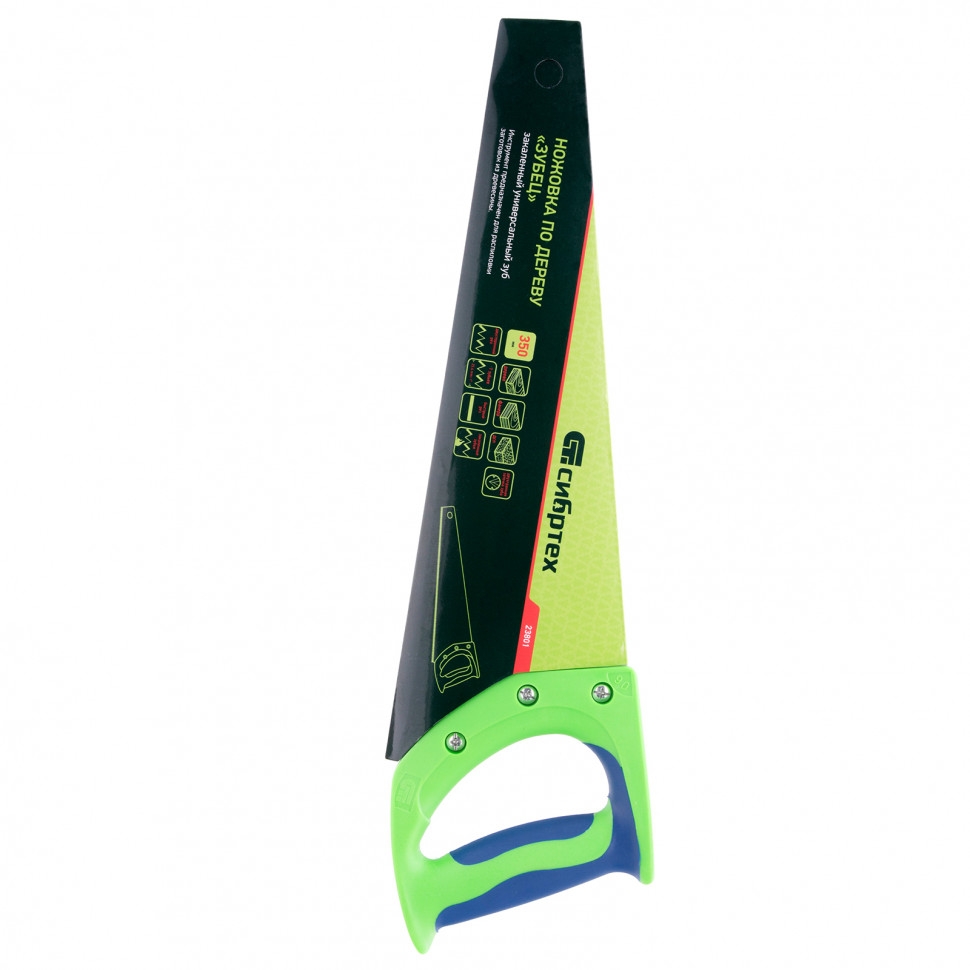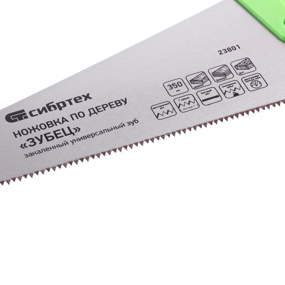 Ножовка по дереву Сибртех «Зубец» 23801 с полотном длиной 350 мм, с калеными зубьями с 2D-заточкой и шагом 7 TPI, с 2-компонентной рукояткой, используется для распиливания заготовок из древесины, фанеры и ДСП. Рабочая часть, содержащая 7 зубьев на дюйм, обеспечивает быстрый двусторонний рез. Режущую кромку можно перетачивать. Ножовка будет полезна столярам, плотникам и домашним мастерам. Преимущества Полотно изготовлено из пружинной стали 65Mn, поэтому выдерживает значительные нагрузки. Зубья прошли закалку, что обеспечивает инструменту высокий ресурс работоспособности. Поверхность полотна покрыта лаком, защищающим ее от коррозии. Рукоятка из ударопрочного пластика прикреплена к полотну 3 винтами, что придает конструкции надежность. Резиновые вставки на рукоятке препятствуют выскальзыванию ее из ладони, что повышает комфортность работы.