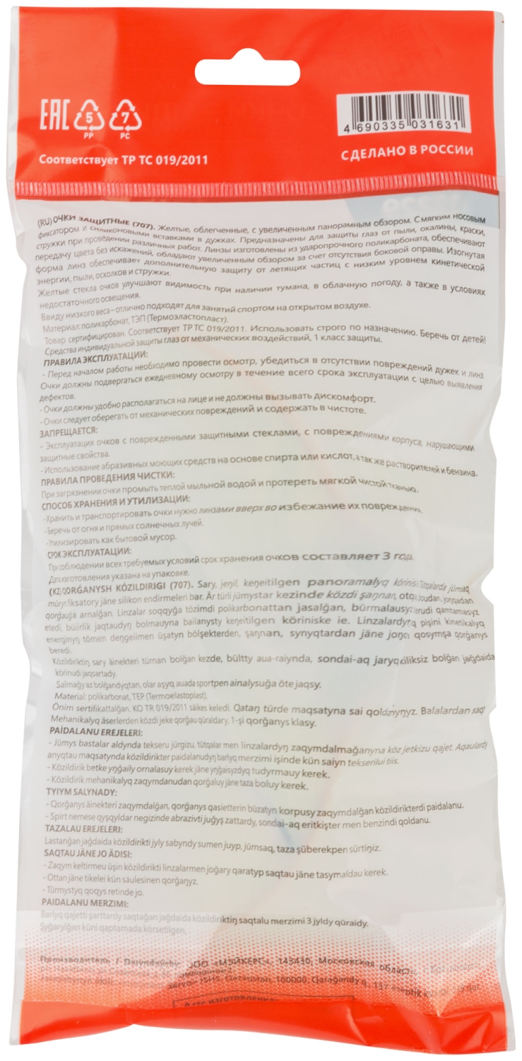 Желтые. С мягким носовым фиксатором. Для защиты глаз от пыли, окалины, краски, стружки при проведении различных работ. Желтые линзы рассеивают свет при работе на ярком солнце, а также улучшают восприятие в туман, в облачную погоду или в условиях недостаточного освещения, делая картинку более насыщенной и контрастной. Материал: линзы и дужки – поликарбонат, вставки – ПВХ. Упаковка: п/э пакет с подвесом.