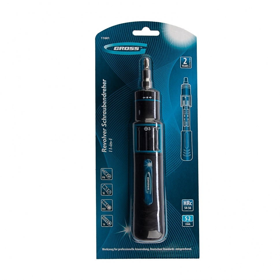 Отвертка реверсивная с револьверным механизмом, 11шт., сталь S2, Gross