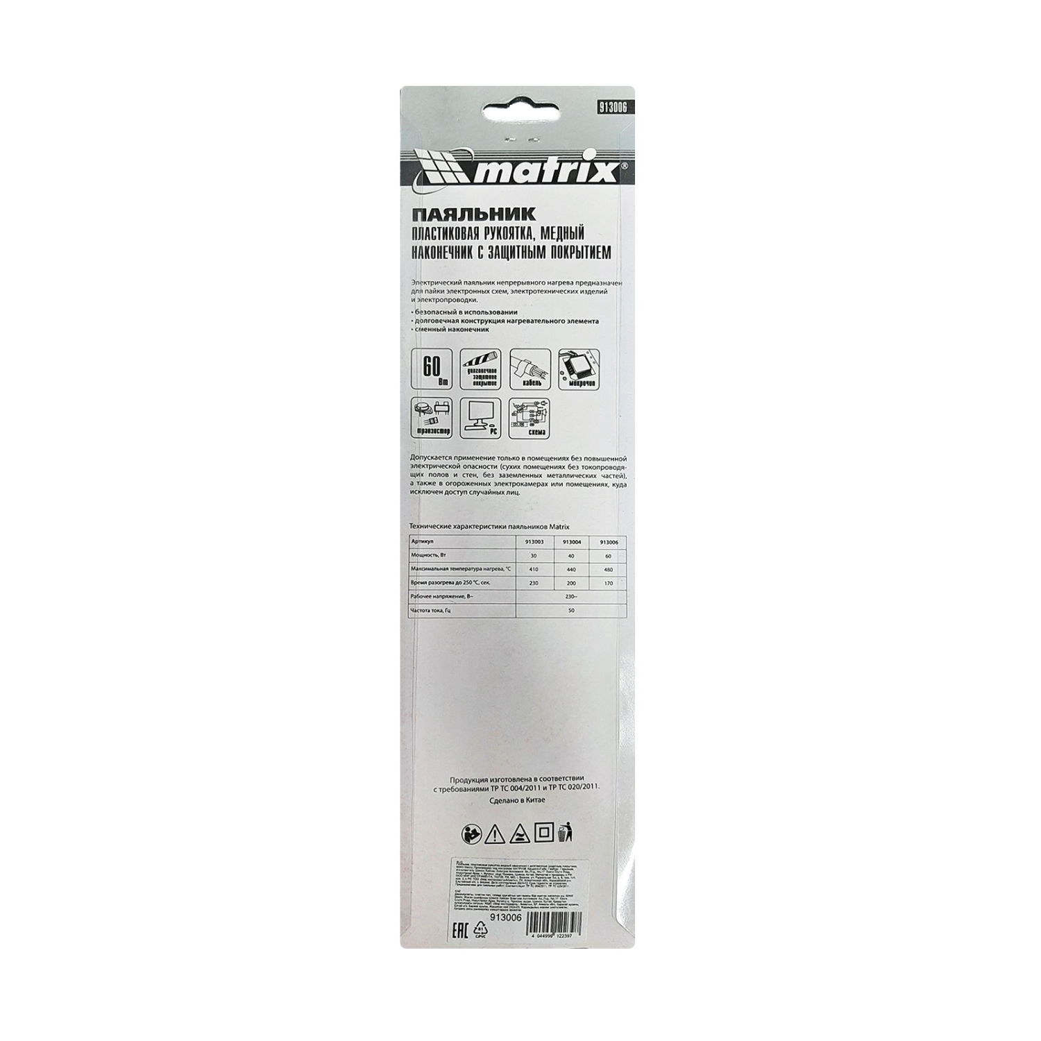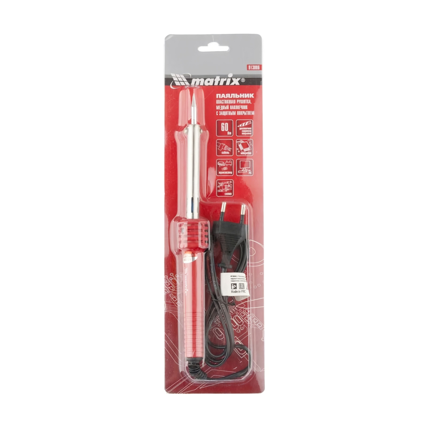 Паяльник, пластик.рук., мед.наконечник с долговеч.защит.покр., 60W Matrix