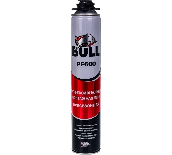 Профессиональная монтажная пена Bull PF600 750 мл PF600 подходит для заполнения пустот и стыков, герметизации трубных соединений, тепло- и звукоизоляции. Входящие в состав компоненты препятствуют образованию грибка и плесени.