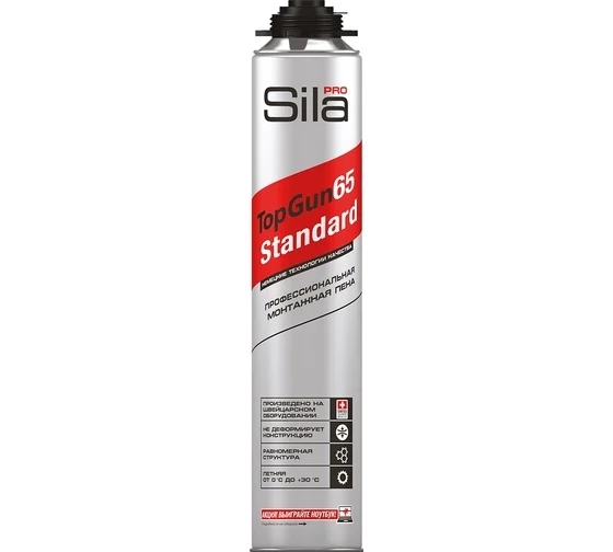 Профессиональная монтажная пена Sila Pro TopGun 65 STANDARD 850 мл SPTGS65 отличается отличной адгезией, равномерной мелкопористой структурой и низким вторичным расширением (до 20%). Продукт используется для установки, герметизации и фиксации оконных и дверных блоков, подоконников, стеновых панелей, для заполненияпустот и швов, тепло- и звукоизоляции, монтажа технических коммуникаций.