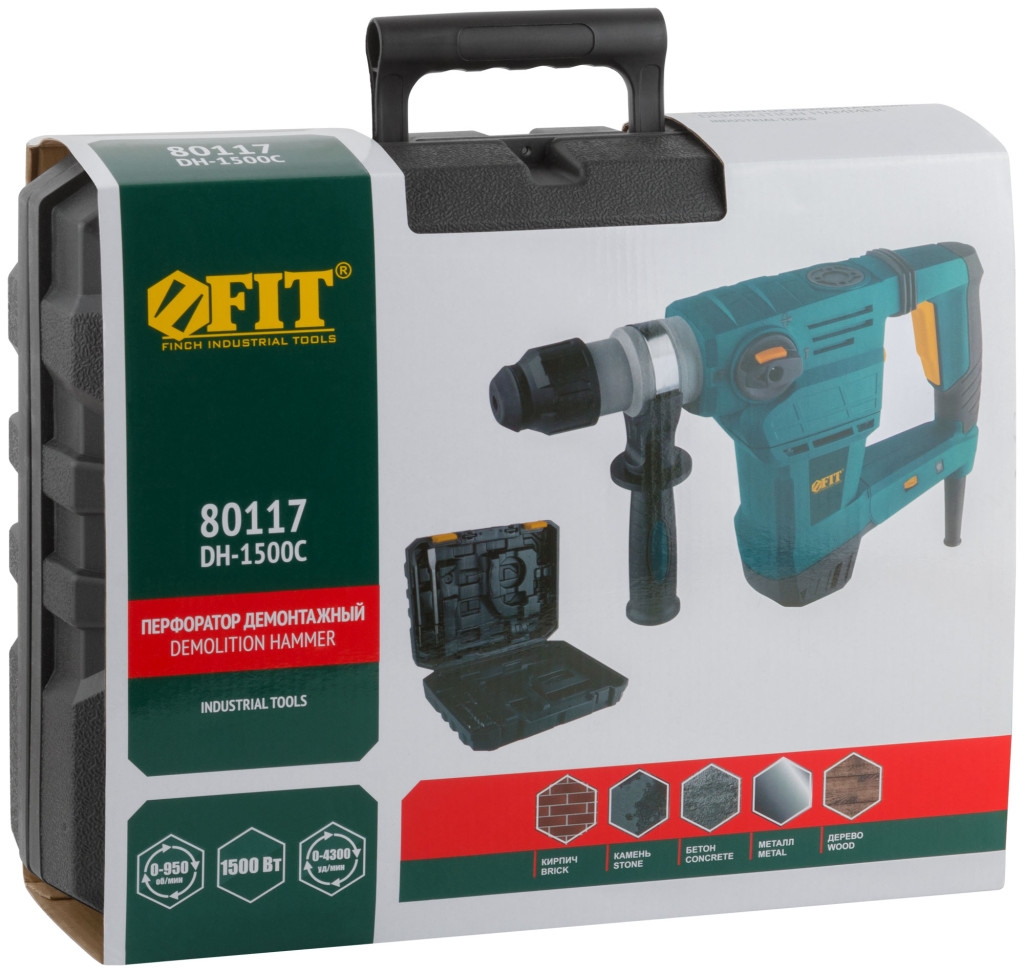Перфоратор демонтажный 1500 Вт; 0-950 об/мин; 0-4300 уд/мин; 5 Дж; 7А; Д/Б/М - 40/32/30 мм; 5,2 кг; кейс. Три режима работы (сверление, сверление с ударом, долбление), режим поворота сменного инструмента, универсальный патрон SDS-PLUS, электропневматическая функция удара, вертикальное расположение двигателя, регулировка частоты вращения, индикатор включения в сеть, демпфер ручки, защита от заклиниваня буров, быстрый доступ к щеткам, резиновые вставки.