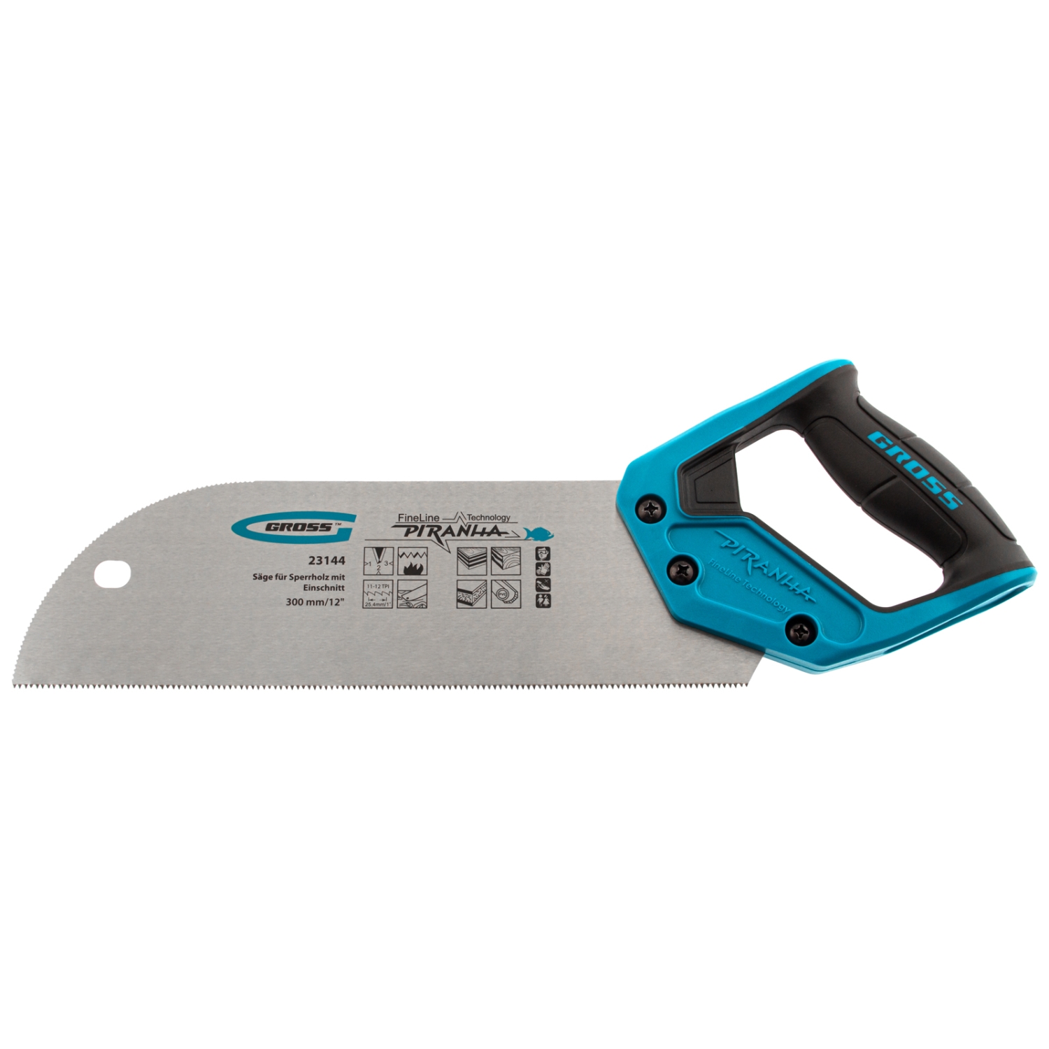 Пила для фанеры с запилом Gross PIRANHA 23144 с полотном размером 300 мм / 12 дюймов, с калеными зубьями с шагом 11-12 TPI и 3D-заточкой, используется для распиловки древесины, фанеры, ДВП и ПВХ в продольном и поперечном направлении. Характеризуется высокой производительностью. Рабочая кромка с мелкими зубьями выполняет ровный гладкий рез. Запил в передней части полотна облегчает работу с заготовками. Пила будет полезна в столярной мастерской. Высокий показатель прочности — полотно изготовлено из японской инструментальной стали SK-5 и имеет твердость 48-52 HRC.
