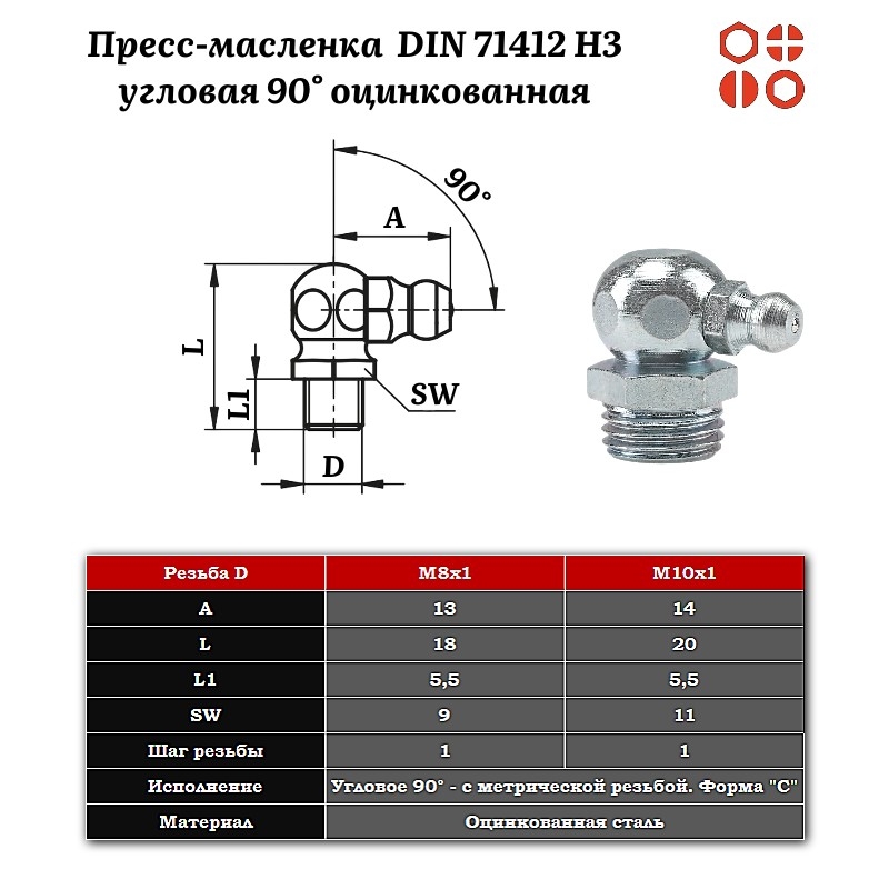 Пресс-масленка М10х1 DIN 71412 H3 угловая 90° оцинкованная, 500 шт.