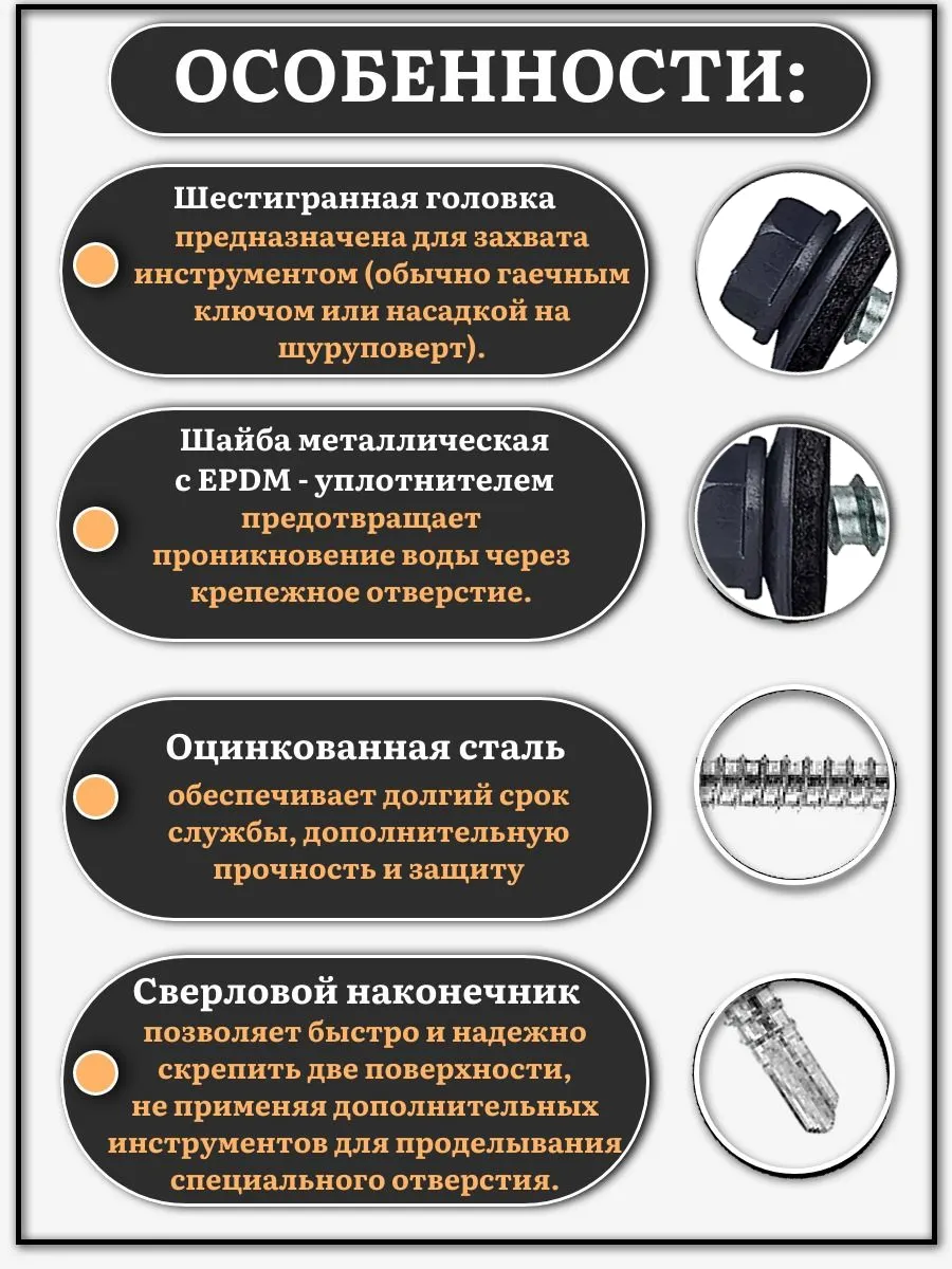 Кровельные саморезы – группа крепежных элементов, которая предназначена для монтажа листовой, черепичной кровли или дранки. Для производства изделий применяется углеводородистая сталь высоких марок. Представляют собой усовершенствованную модель шурупа с наконечником сверло, металлической шайбой с прокладкой EPDM (резина с очень высоким содержанием каучука).