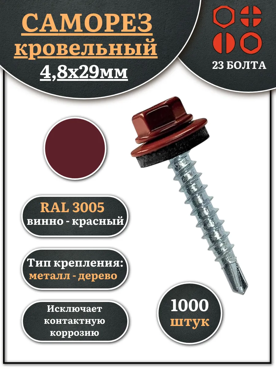 Саморез кровельный, 4,8х29 винно-красный RAL3005 1000 шт