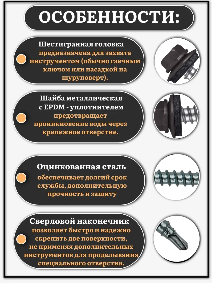 Кровельные саморезы – группа крепежных элементов, которая предназначена для монтажа листовой, черепичной кровли или дранки. Для производства изделий применяется углеводородистая сталь высоких марок. Представляют собой усовершенствованную модель шурупа с наконечником сверло, металлической шайбой с прокладкой EPDM (резина с очень высоким содержанием каучука).