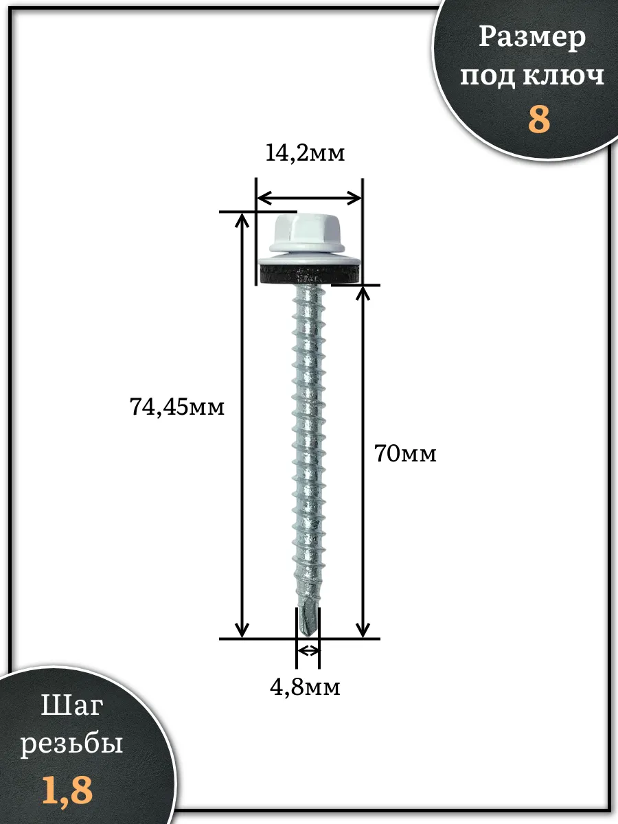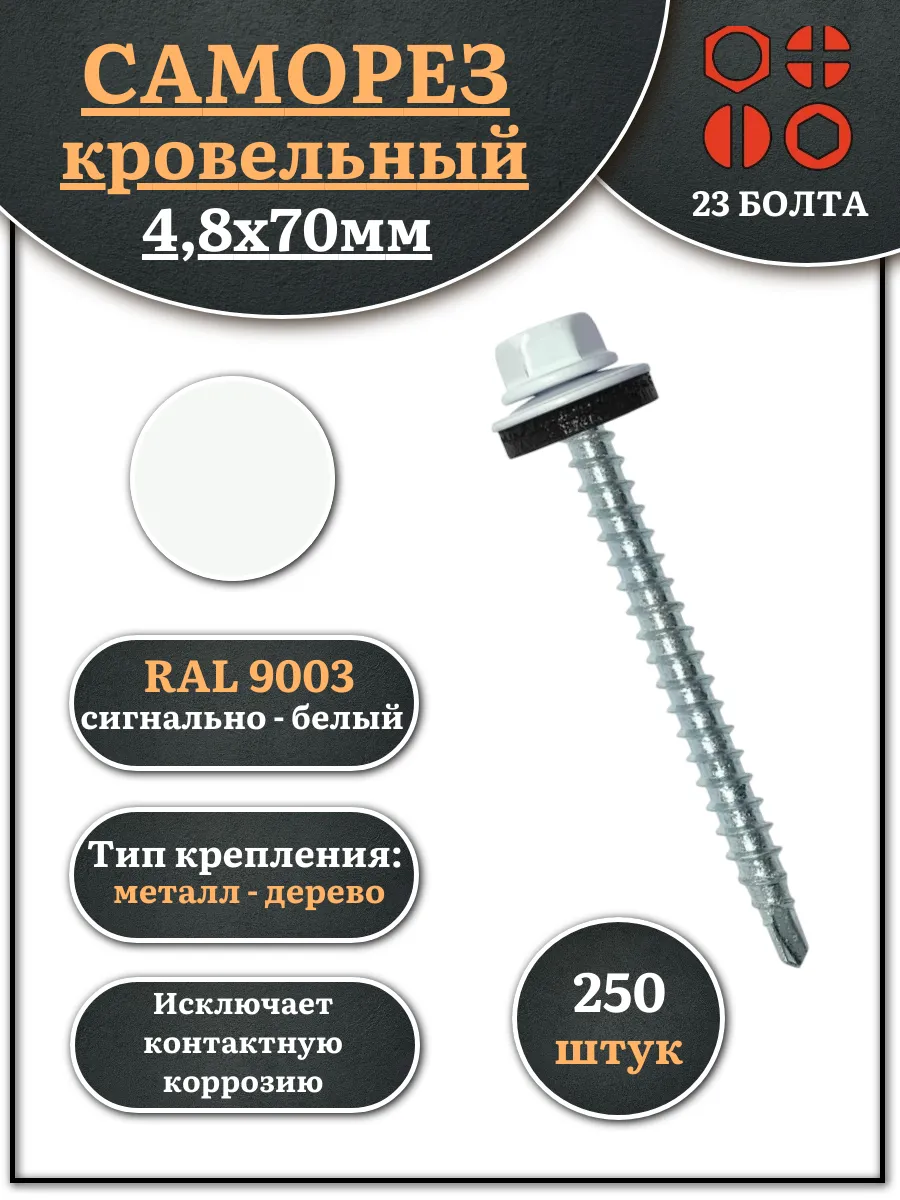 Саморез кровельный, 4,8х70 сигнально-белый RAL9003 250 шт