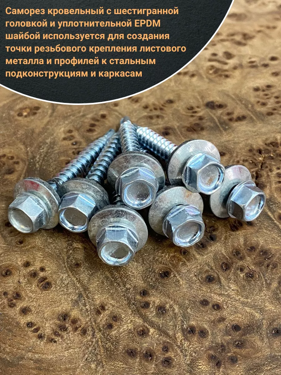 Материал: Оцинкованная сталь Саморез кровельный с шестигранной головкой и уплотнительной EPDM шайбой используется для создания точки резьбового крепления листового металла и профилей к стальным подконструкциям и каркасам. Служит в качестве элемента точечного крепления для водонепроницаемого соединения типа “металл - металл”. Самосверлящий шуруп предназначен для быстрой установки за один этап. Самосверлящий шуруп из оцинкованной стали представляет собой резьбовой элемент крепления для монтажа металлических кровельных покрытий. Шестигранный шуруп оснащен пресс-шайбой интегрированной с уплотняющей прокладкой из синтетического каучука EPDM. Параметры резьбы и форма наконечника самореза в виде сверла максимально адаптированы для крепления кровельного металла к металлическим подконструкциям.