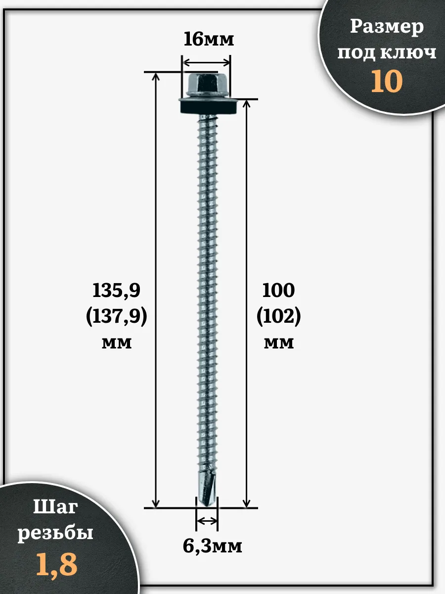 | Саморез кровельный 6,3х100(102) мм с шайбой (под сверло),ОЦ 50 шт | B03006310033A00ф50 | 1 шт. |