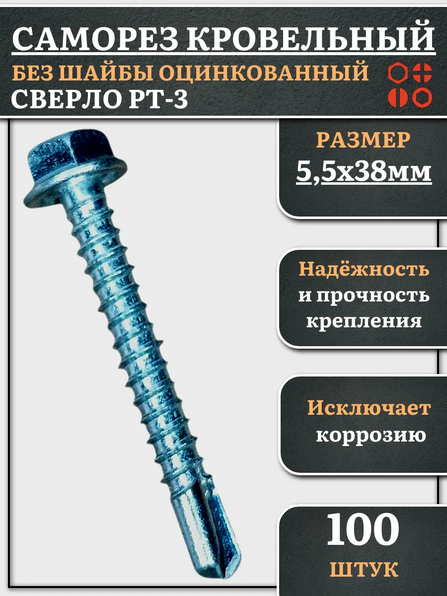 Саморез кровельный без шайбы, 5,5х38 ОЦ сверло РТ-3, 100 шт.