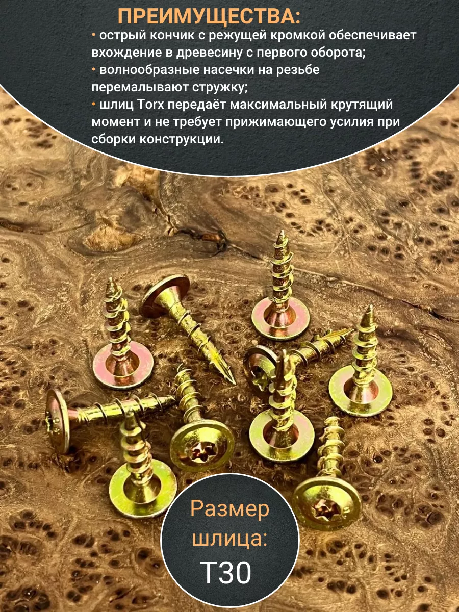 Конструкционный шуруп для дерева прессшайба TORX , ж/ц, имеет специальную форму острия, которая рассверливает отверстие в материале. Фреза на ножке защищает проходное отверстие в дереве, тем самым снижая трение и облегчая закручивание.