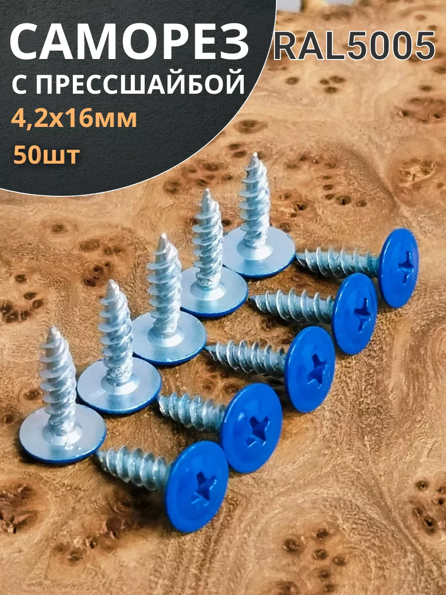Саморез с прессшайбой 4,2х16 острый RAL5005 (синий), 50 шт.