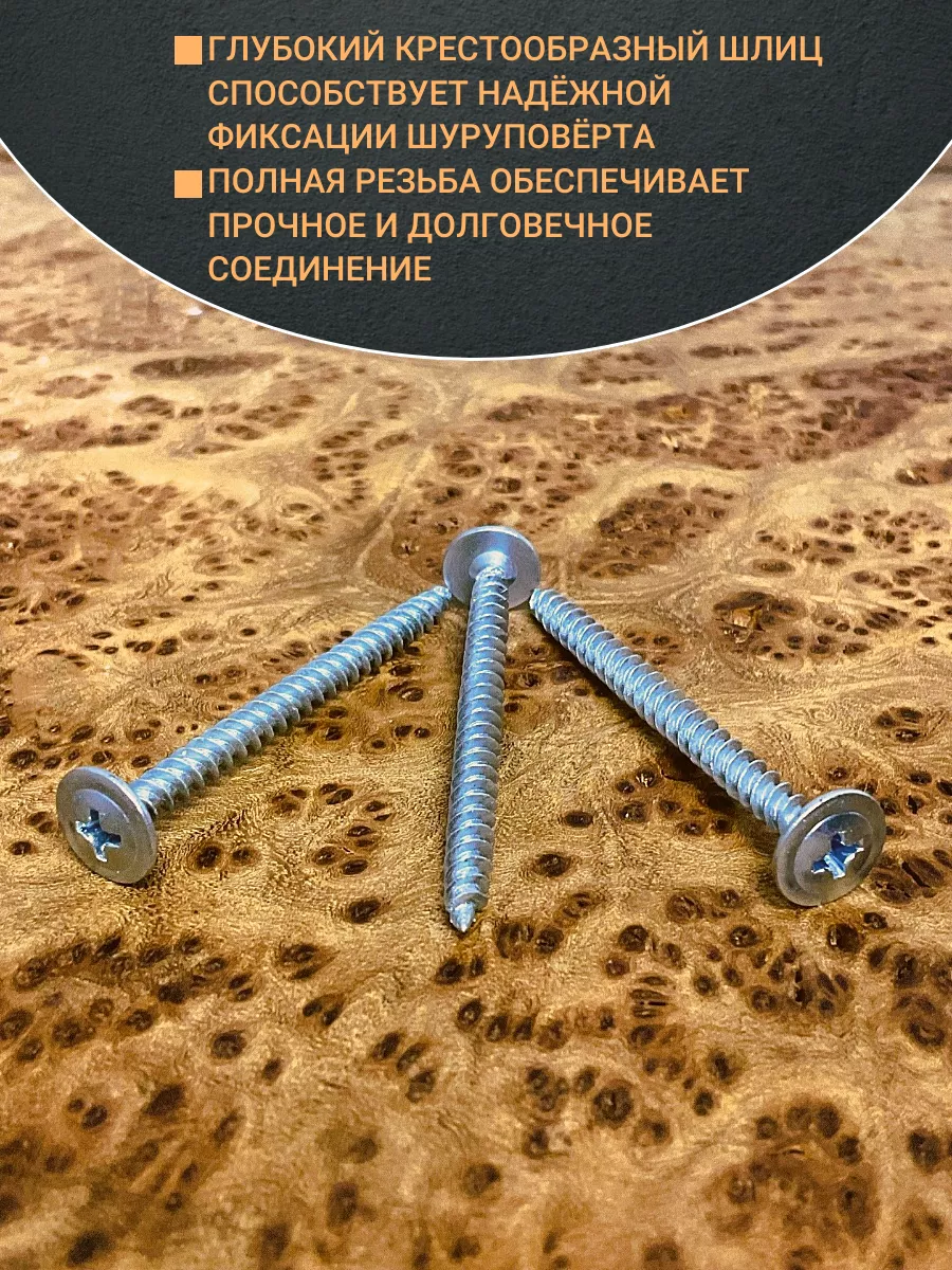 Саморезы с прессшайбой имеют широкую полусферическую головку с крестовым шлицем и стержень с частой резьбой. Обеспечивают прочное крепление и защищают материалы от продавливания. С их помощью к металлическому или деревянному основанию крепят фанеру, листовую сталь, оргалит, профнастил и др. С острым наконечником – для монтажа на деревянное основание; с наконечником-сверлом – для монтажа по металлу.