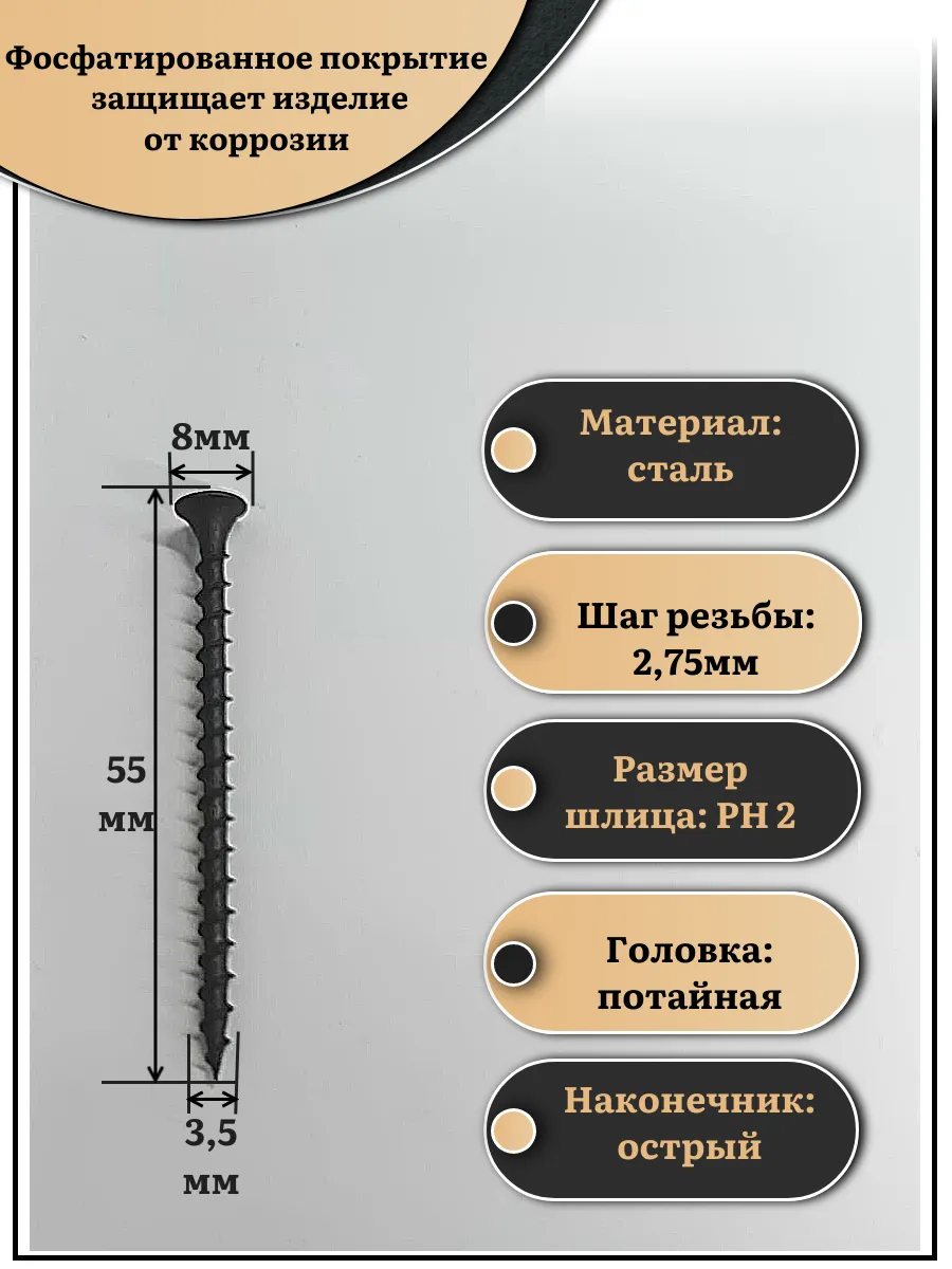 Саморезы по г/к используются для крепления листов гипсокартона любых видов. У него потайная шляпка и широкий шаг резьбы. Покрытие оцинкованное или фосфатированное. С помощью таких метизов можно выполнить монтаж листов гипсокартона к различным конструкциям из металла.