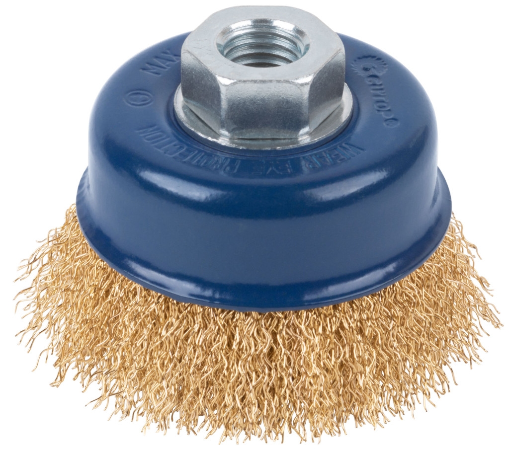Щетка для УШМ, тип «Чашка», М14, отлично подходит для обработки больших плоскостей. Форма «Чашка» обеспечивает хорошую площадь прилегания к поверхности. Конструкция щетки оснащена усиленной гайкой с шайбой (кроме D65), которая способствует предотвращению деформации изделия. Идеальная балансировка щеток значительно продлевает срок службы инструмента.