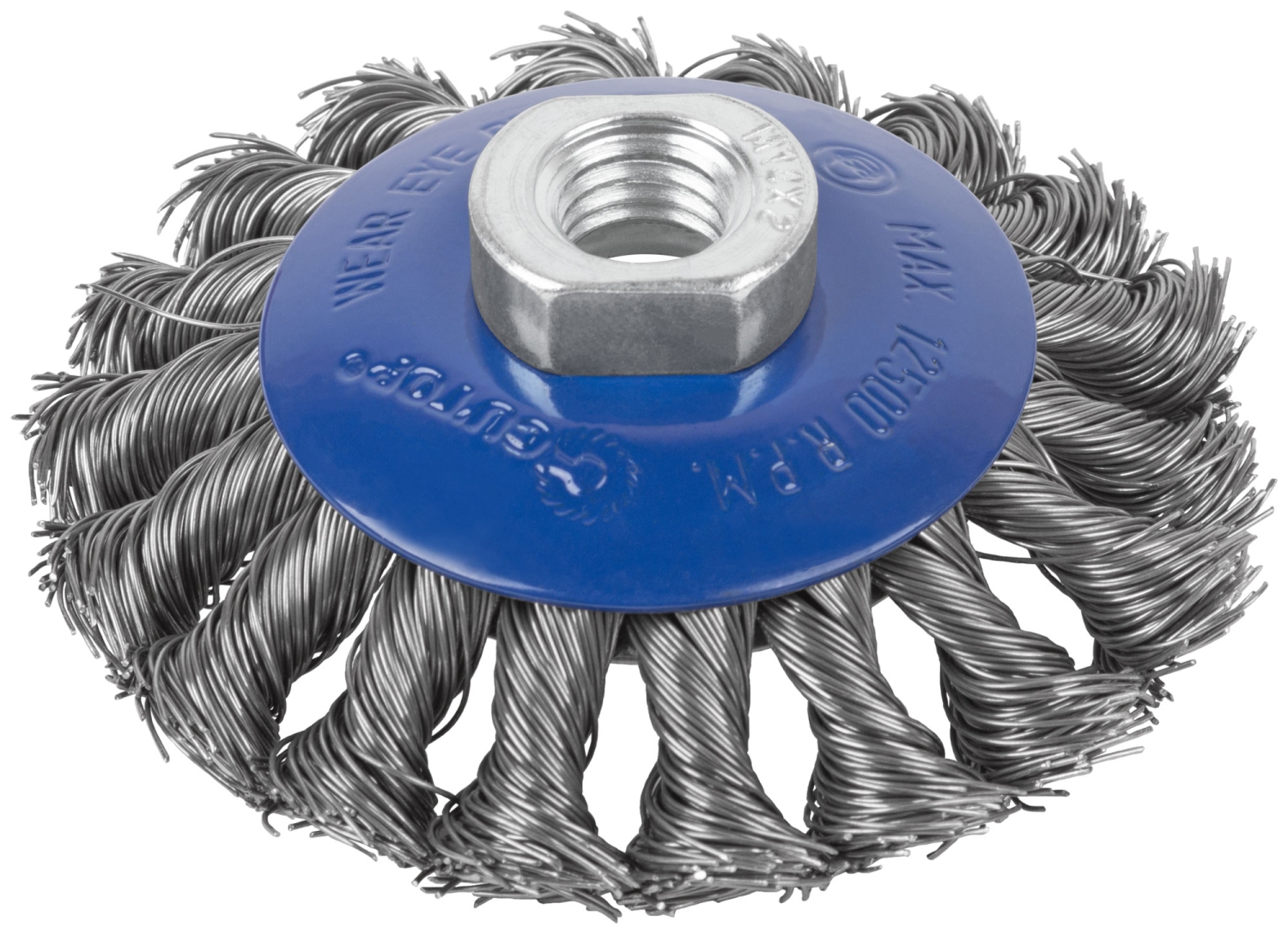 Щетка для УШМ, тип «Тарелка», посадка М14. Предназначена для очистки различных металлических и деревянных поверхностей, снятия толстого слоя ржавчины, удаления лакокрасочных покрытий, заусенцев и окалины, обработки сварных швов, различных загрязнений. Тип «Тарелка» оптимально подходит для обработки углов, пазов, изгибов и других труднодоступных участков. Грубая зачистка, стальная проволока 0,5 мм.
