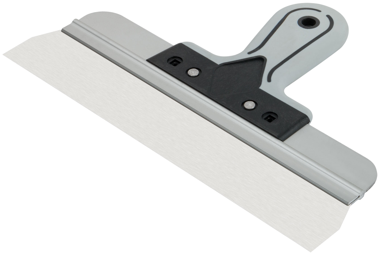 Профи. Для работы на поверхностях большой площади. Материал: лезвие из нержавеющей стали, алюминиевое ребро жесткости, пластиковая прорезиненная ручка.
