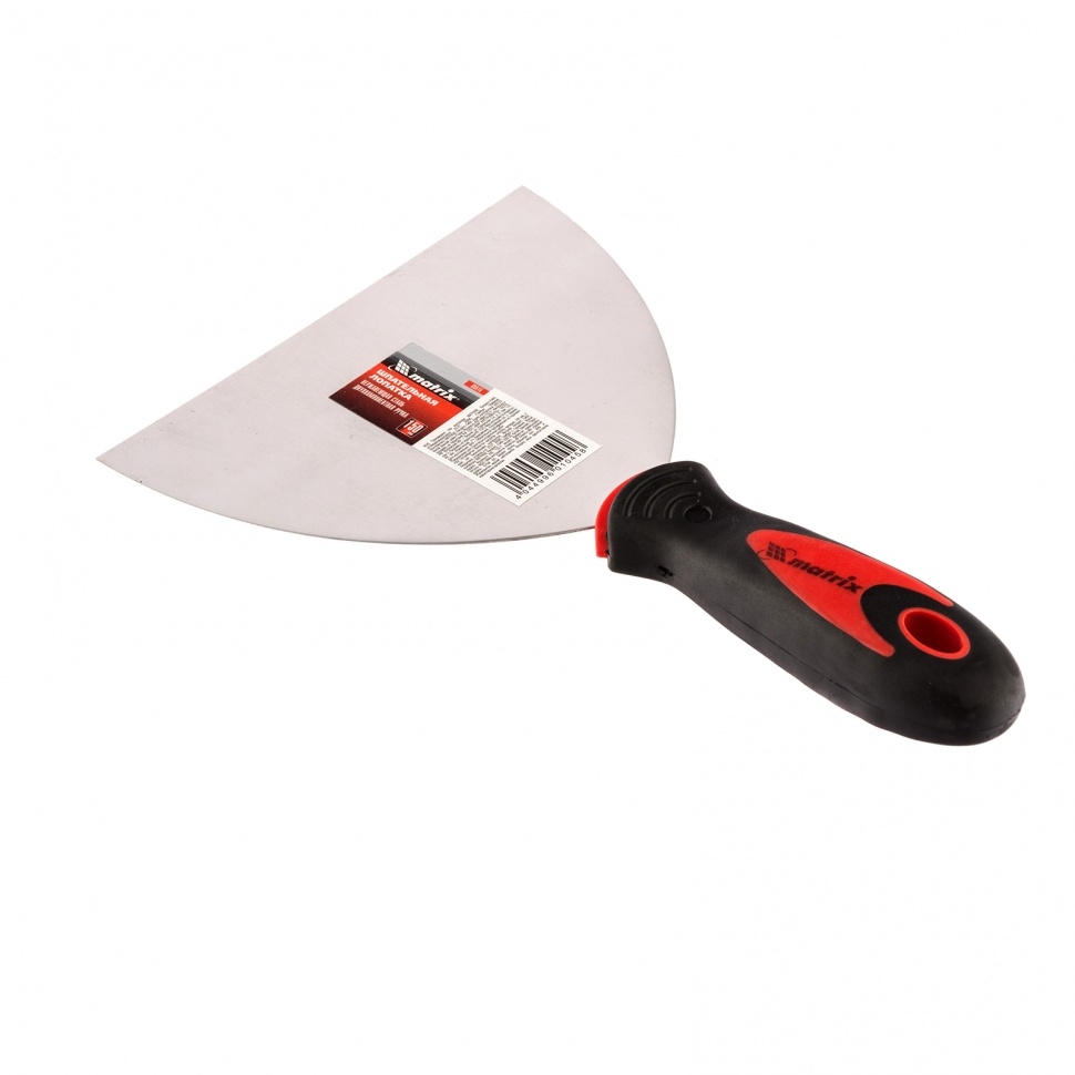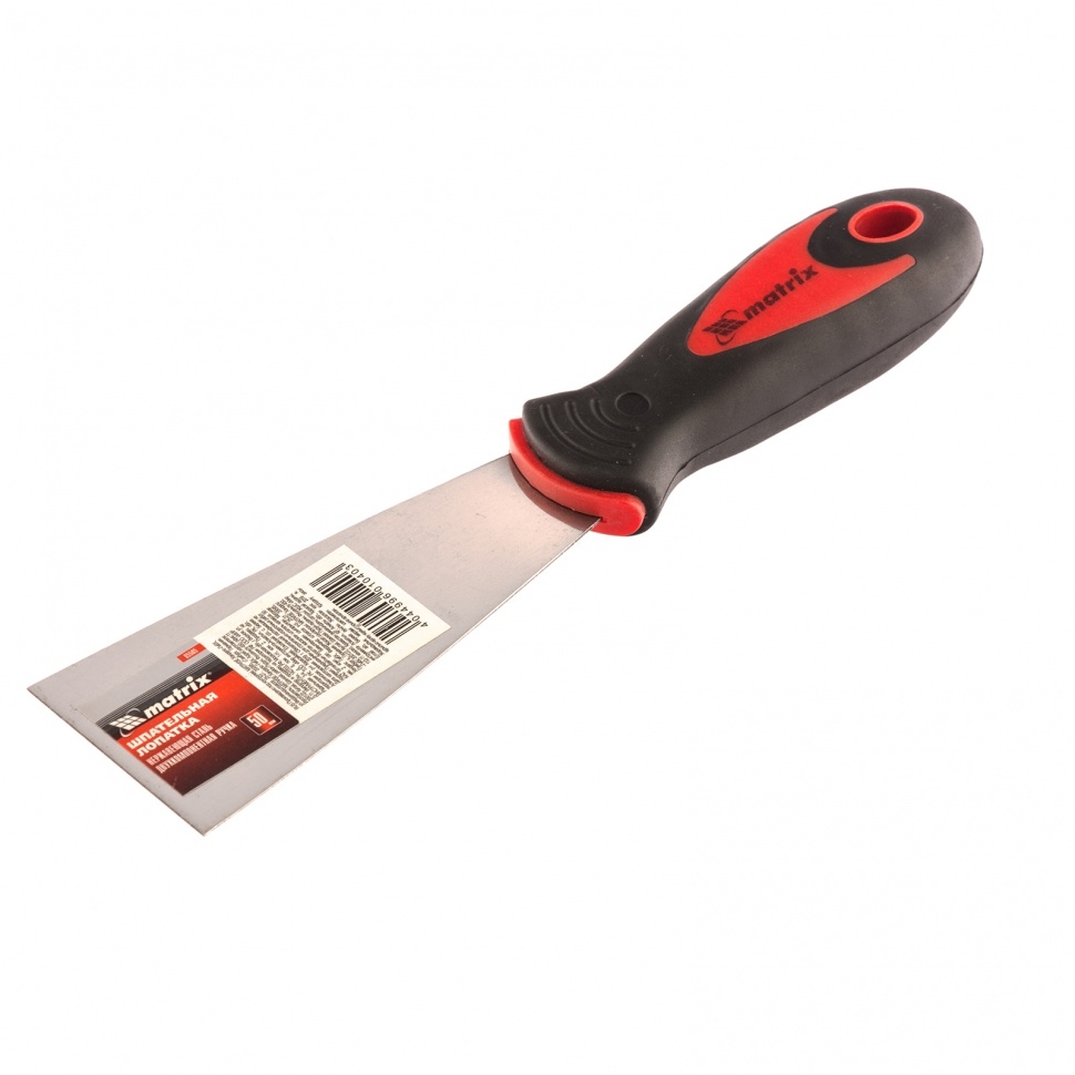 Шпательная лопатка из нержавеющей стали Matrix 85505 шириной 50 мм, с двухкомпонентной рукояткой, предназначена для нанесения и выравнивания строительных смесей, шпаклевания швов, заполнения трещин, удаления старых обоев. За счет компактных размеров инструмент подходит для корректировки мелких трещин и неровностей.