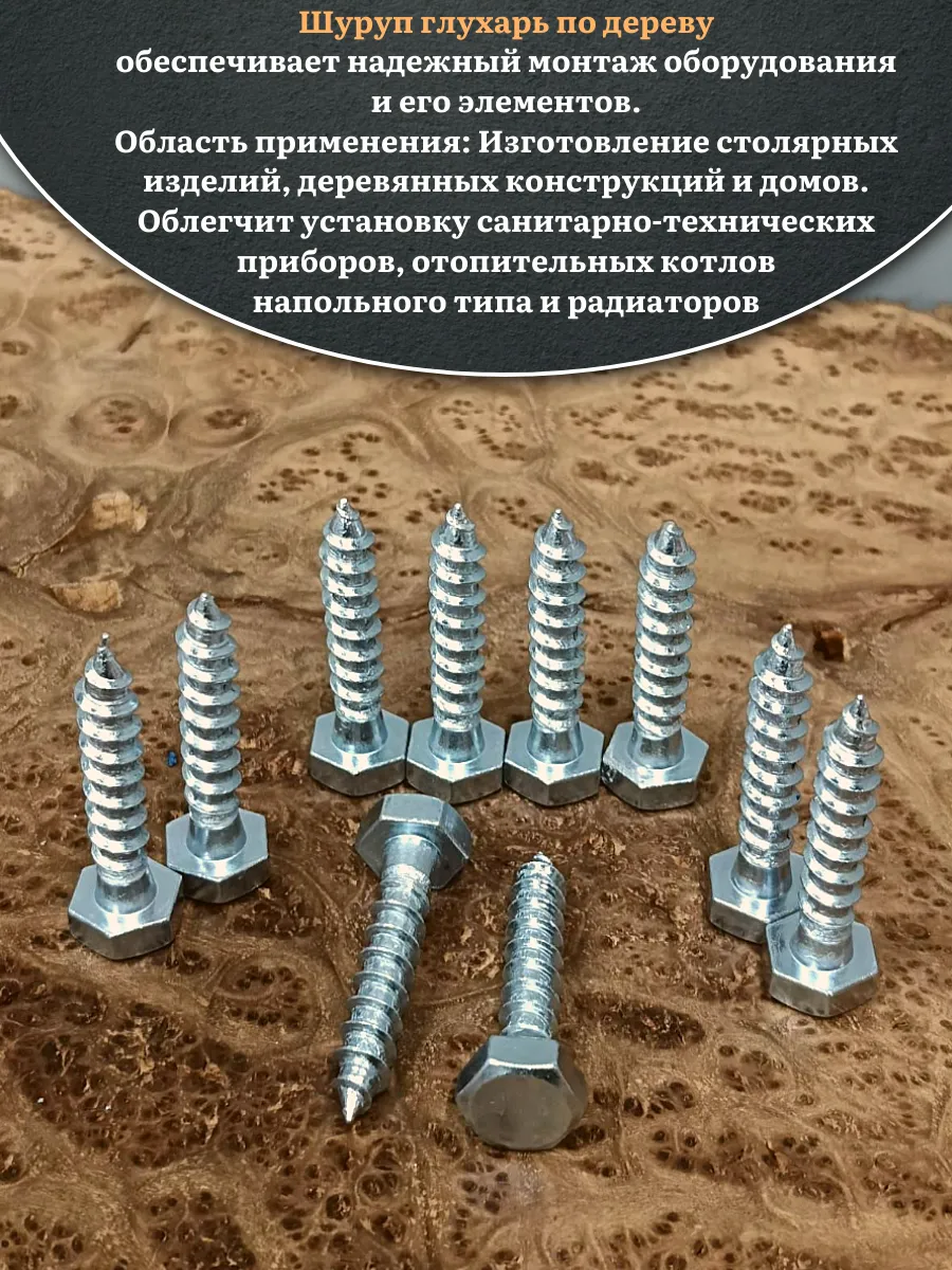 Крепёжное изделие в виде стержня с шестигранной или квадратной головкой под ключ и специальной наружной резьбой, образующей внутреннюю резьбу в отверстии соединяемого предмета. Саморез делается из оцинкованной стали. Такой крепеж обеспечивает надежный монтаж оборудования и его элементов. В состав изделия входит стержень, имеющий неполную резьбу, и шестигранная головка «под ключ». Область применения: Изготовление столярных изделий, деревянных конструкций и домов, установку санитарно-технических приборов, отопительных котлов напольного типа и радиаторов облегчит саморез типа «глухарь», соответствующий DIN 571. Чтобы смонтировать крепеж в строительную конструкцию из кирпича, природного камня или бетона, саморез нужно дополнительно укомплектовать разжимной втулкой из полимерного материала с соответствующими размерами. Изделие можно устанавливать в горизонтальных или вертикальных поверхностях.