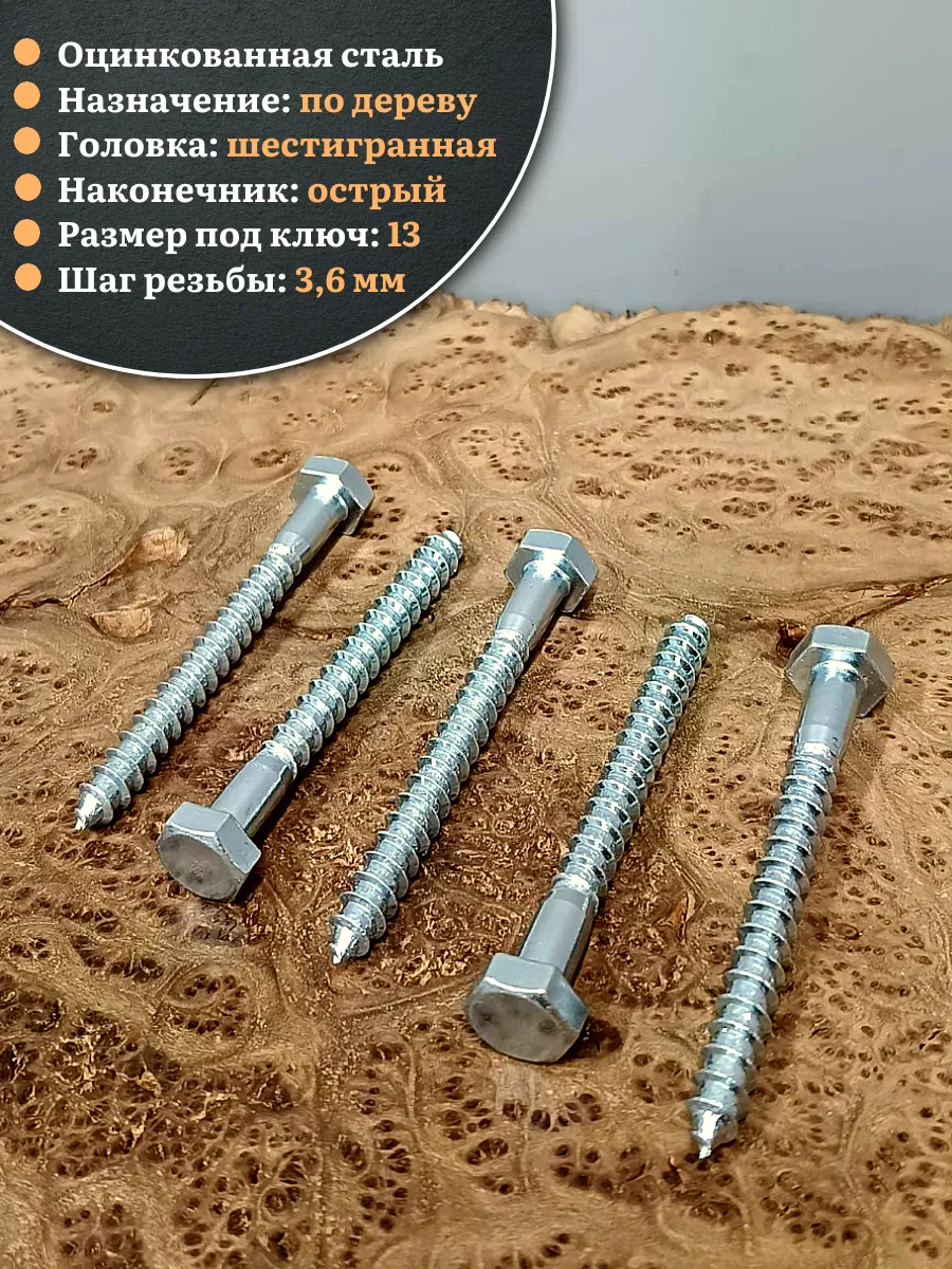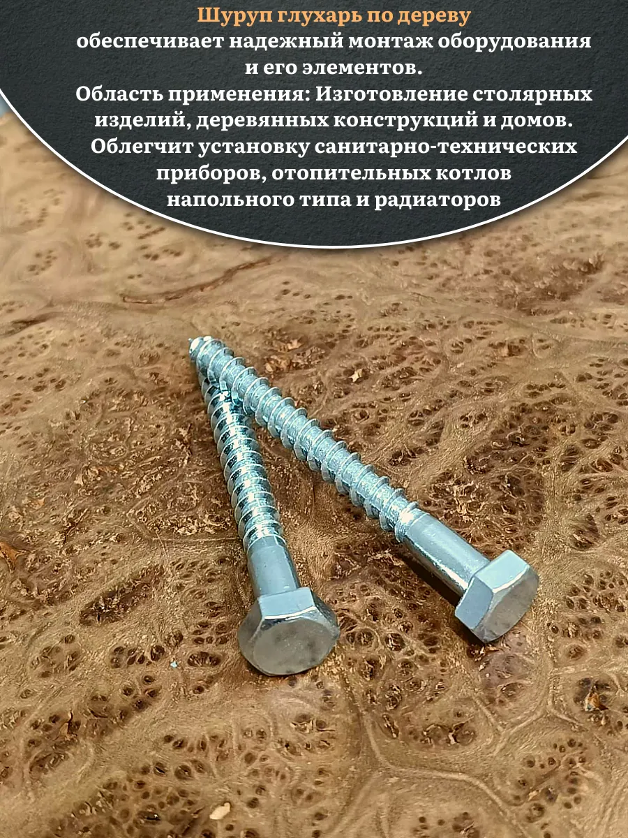 Саморез делается из оцинкованной стали. Такой крепеж обеспечивает надежный монтаж оборудования и его элементов. В состав изделия входит стержень, имеющий неполную резьбу, и шестигранная головка «под ключ». Область применения: Изготовление столярных изделий, деревянных конструкций и домов, установку санитарно-технических приборов, отопительных котлов напольного типа и радиаторов облегчит саморез типа «глухарь», соответствующий DIN 571. Чтобы смонтировать крепеж в строительную конструкцию из кирпича, природного камня или бетона, саморез нужно дополнительно укомплектовать разжимной втулкой из полимерного материала с соответствующими размерами. Изделие можно устанавливать в горизонтальных или вертикальных поверхностях.