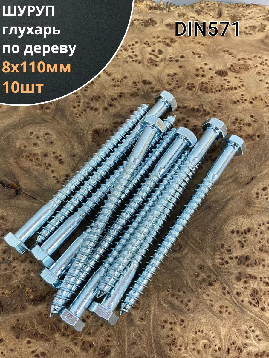 Крепёжное изделие в виде стержня с шестигранной или квадратной головкой под ключ и специальной наружной резьбой, образующей внутреннюю резьбу в отверстии соединяемого предмета. Саморез делается из оцинкованной стали. Такой крепеж обеспечивает надежный монтаж оборудования и его элементов. В состав изделия входит стержень, имеющий неполную резьбу, и шестигранная головка «под ключ». Область применения: Изготовление столярных изделий, деревянных конструкций и домов, установку санитарно-технических приборов, отопительных котлов напольного типа и радиаторов облегчит саморез типа «глухарь», соответствующий DIN 571. Чтобы смонтировать крепеж в строительную конструкцию из кирпича, природного камня или бетона, саморез нужно дополнительно укомплектовать разжимной втулкой из полимерного материала с соответствующими размерами. Изделие можно устанавливать в горизонтальных или вертикальных поверхностях.