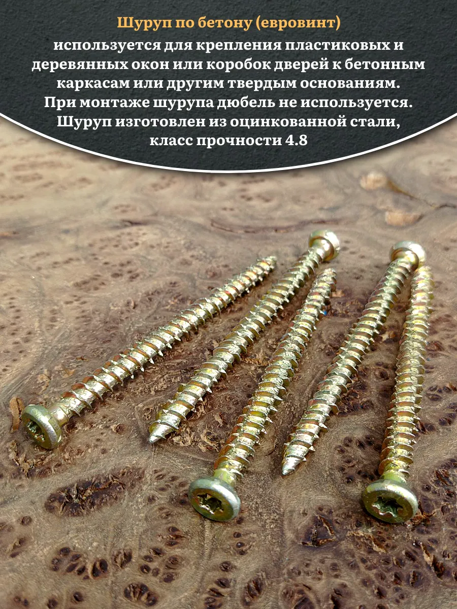 Шуруп — это металлический крепеж, представляющий собой стержень с головкой и острым наконечником. Универсальность проявляется в конструкции и области применения. Назначение шурупа — стягивать, скреплять между собой элементы: деревянных, древесностружечных и гипсокартонных плит, из тонкого листового металла. Саморез-шуруп "Бетон Нагель" с потайной головкой, с насечками и шлицем TORX. Шуруп широко используется в строительстве и при проведении ремонтно-отделочных работ. Часто применяются для крепления оконных рам и дверных коробок. Данный саморез изготавливается из стали и потом покрывается желтым цинком. По всей длине стержня расположена острая попеременная резьба. Шуруп имеет острый наконечник и потайную шляпку. Для работы с данной моделью шурупа необходима бита TORX. Материал основания: бетон, природный камень, кирпич.