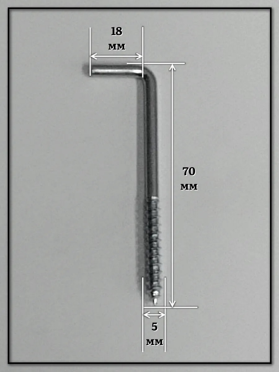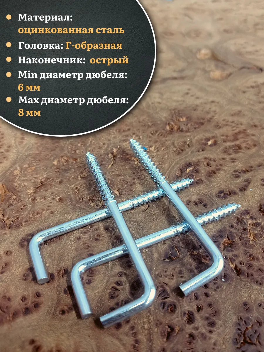 Шуруп-костыль - стальной шуруп в виде стержня Г-образной формы. Шуруп выполнен из качественной стали с оцинкованным покрытием, что обеспечивает устойчивость изделия к воздействию влаги. Применяется для крепления к деревянным поверхностям легких съемных конструкций, а так же может быть использован при крепеже к бетону, природному камню или кирпичу вместе с пластиковыми дюбелями. Шуруп-костыль в основном используют в производстве мебели, деревянном домостроении, при монтажных работах и в быту. Материал шурупа: сталь, Покрытие шурупа: оцинкованное, Головка: Г-образная.