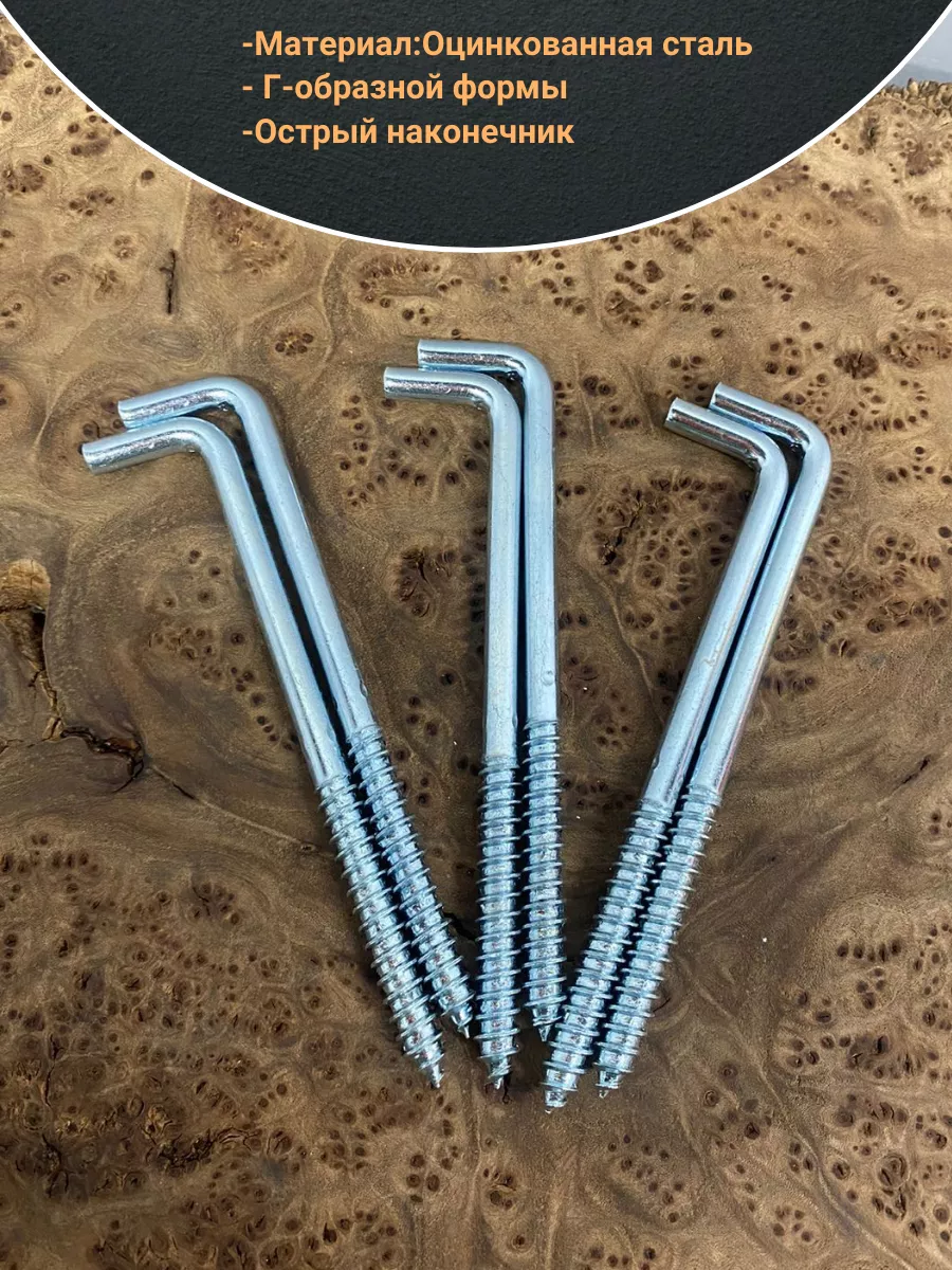 Шуруп-костыль - стальной шуруп в виде стержня Г-образной формы. Шуруп выполнен из качественной стали с оцинкованным покрытием, что обеспечивает устойчивость изделия к воздействию влаги. Применяется для крепления к деревянным поверхностям легких съемных конструкций, а так же может быть использован при крепеже к бетону, природному камню или кирпичу вместе с пластиковыми дюбелями. Шуруп-костыль в основном используют в производстве мебели, деревянном домостроении, при монтажных работах и в быту. Материал шурупа: сталь, Покрытие шурупа: оцинкованное, Головка: Г-образная.