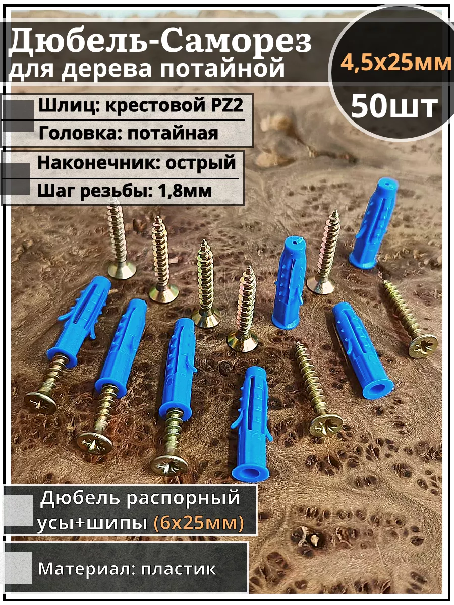 Шуруп саморез 4,5х25 мм ЖЦ с дюбелем 6х25, 50 шт.