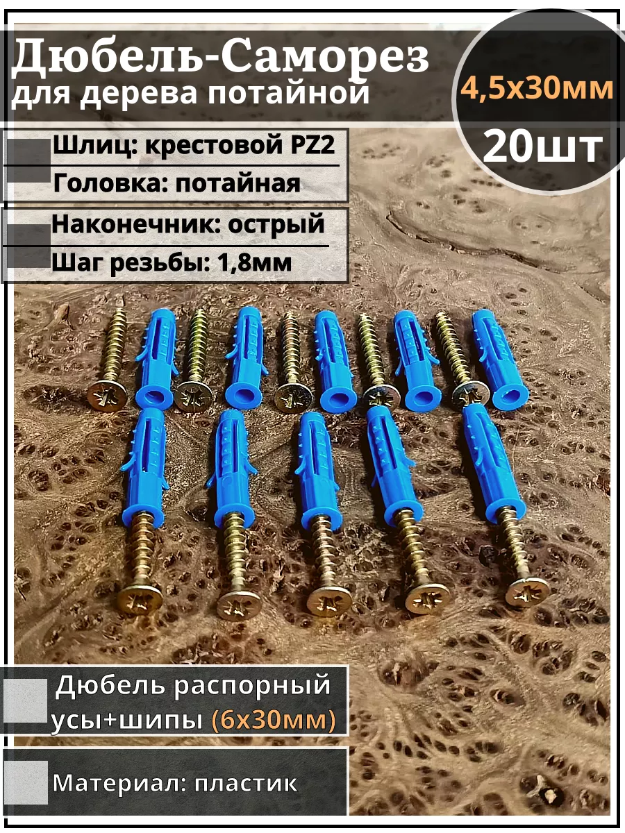 | Шуруп саморез 4,5х30 мм ЖЦ с дюбелем 6х30, 10 шт. | B04004503060N0Ф/B23300603006000ф10 | 1 шт. |
