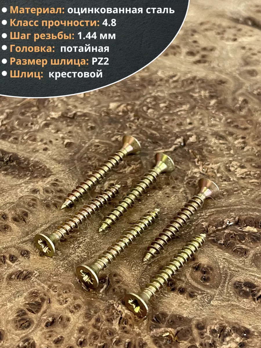 Шуруп — это металлический крепеж, представляющий собой стержень с головкой и острым наконечником. Универсальность проявляется в конструкции и области применения. Назначение шурупа — стягивать, скреплять между собой элементы: деревянных, древесностружечных и гипсокартонных плит, из тонкого листового металла. Крепежное изделие изготовлено из оцинкованной стали с дополнительной пассивацией. Саморез имеет желтый цвет. Его классическая конструкция включает заостренный цилиндрический стержень с винтовой нарезкой по всей длине, а также потайную головку с крестообразным шлицем PZ. Этот элемент служит для передачи крутящего момента от инструмента – отвертки, шуруповерта при закручивании или выкручивании крепежа.