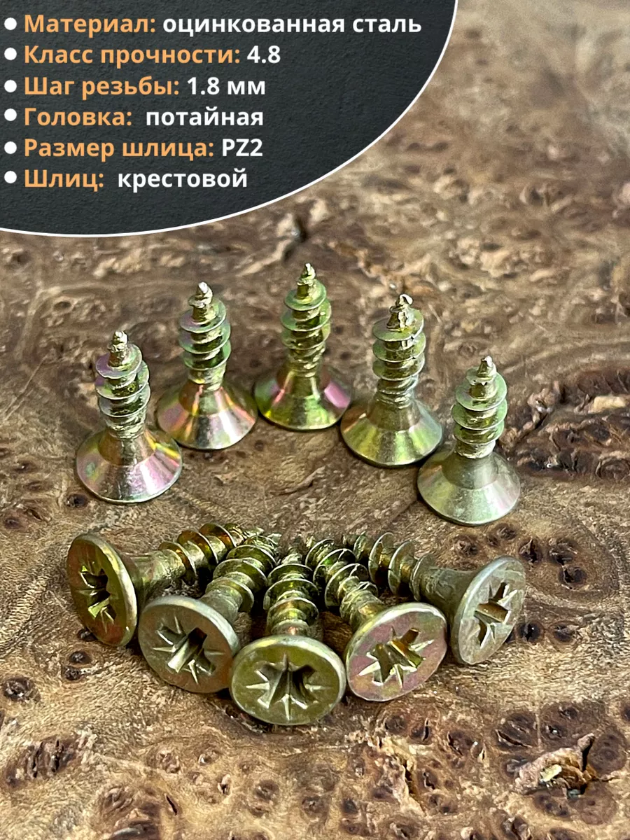 Шуруп — это металлический крепеж, представляющий собой стержень с головкой и острым наконечником. Универсальность проявляется в конструкции и области применения. Назначение шурупа — стягивать, скреплять между собой элементы: деревянных, древесностружечных и гипсокартонных плит, из тонкого листового металла. Крепежное изделие изготовлено из оцинкованной стали с дополнительной пассивацией. Саморез имеет желтый цвет. Его классическая конструкция включает заостренный цилиндрический стержень с винтовой нарезкой по всей длине, а также потайную головку с крестообразным шлицем PZ. Этот элемент служит для передачи крутящего момента от инструмента – отвертки, шуруповерта при закручивании или выкручивании крепежа.