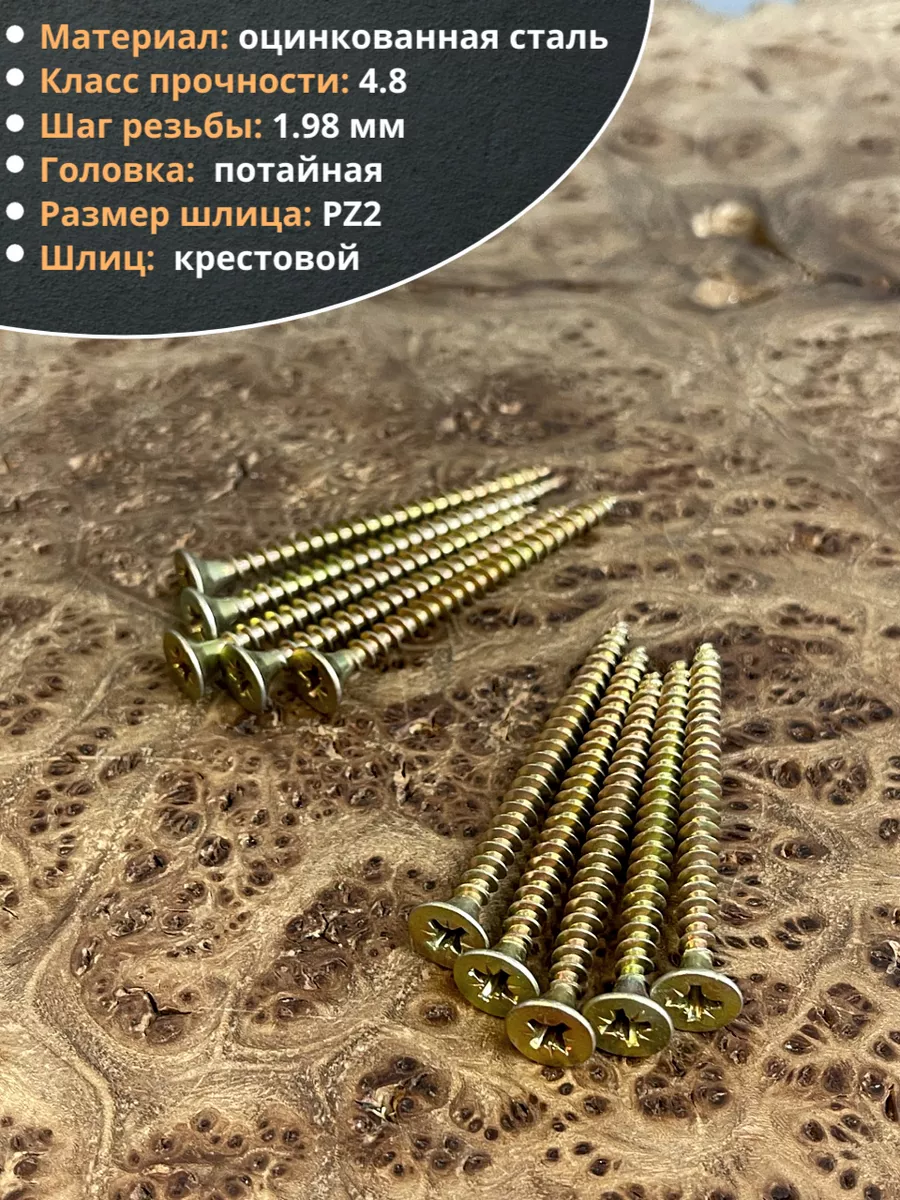 Шуруп — это металлический крепеж, представляющий собой стержень с головкой и острым наконечником. Универсальность проявляется в конструкции и области применения. Назначение шурупа — стягивать, скреплять между собой элементы: деревянных, древесностружечных и гипсокартонных плит, из тонкого листового металла. Крепежное изделие изготовлено из оцинкованной стали с дополнительной пассивацией. Саморез имеет желтый цвет. Его классическая конструкция включает заостренный цилиндрический стержень с винтовой нарезкой по всей длине, а также потайную головку с крестообразным шлицем PZ. Этот элемент служит для передачи крутящего момента от инструмента – отвертки, шуруповерта при закручивании или выкручивании крепежа.
