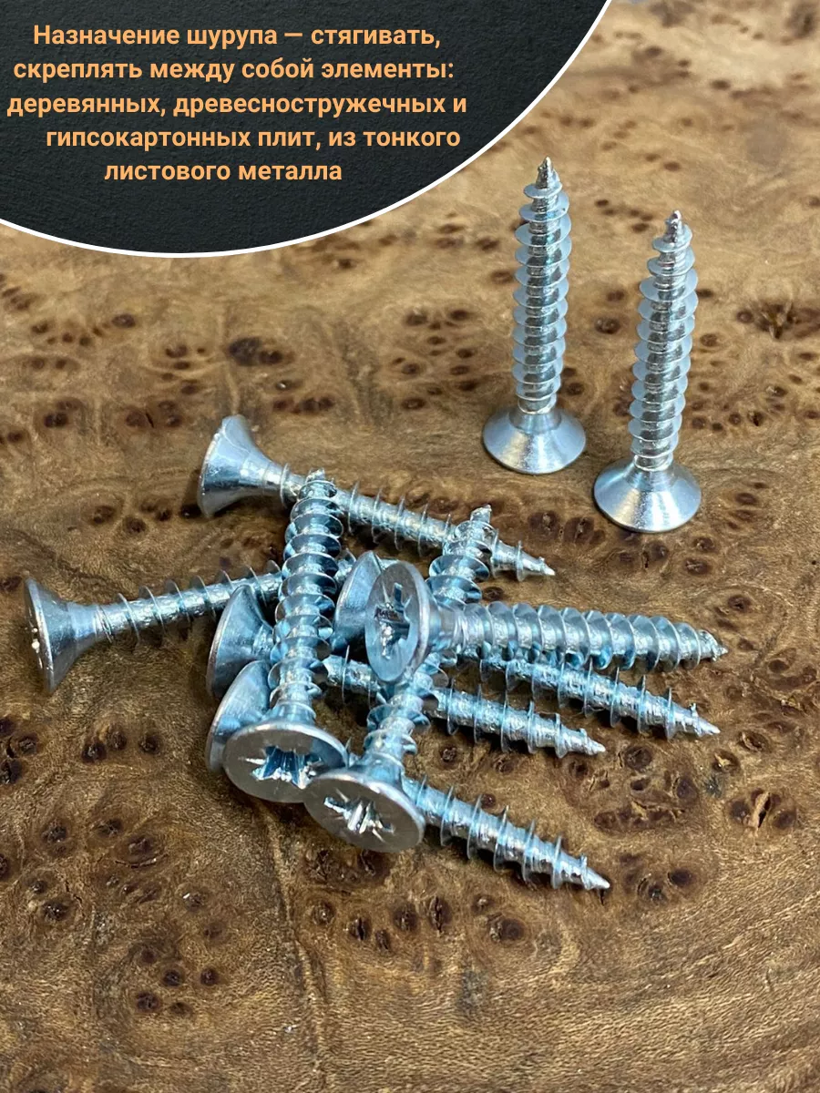 Шуруп — это металлический крепеж, представляющий собой стержень с головкой и острым наконечником. Универсальность проявляется в конструкции и области применения. Назначение шурупа — стягивать, скреплять между собой элементы: деревянных, древесностружечных и гипсокартонных плит, из тонкого листового металла.