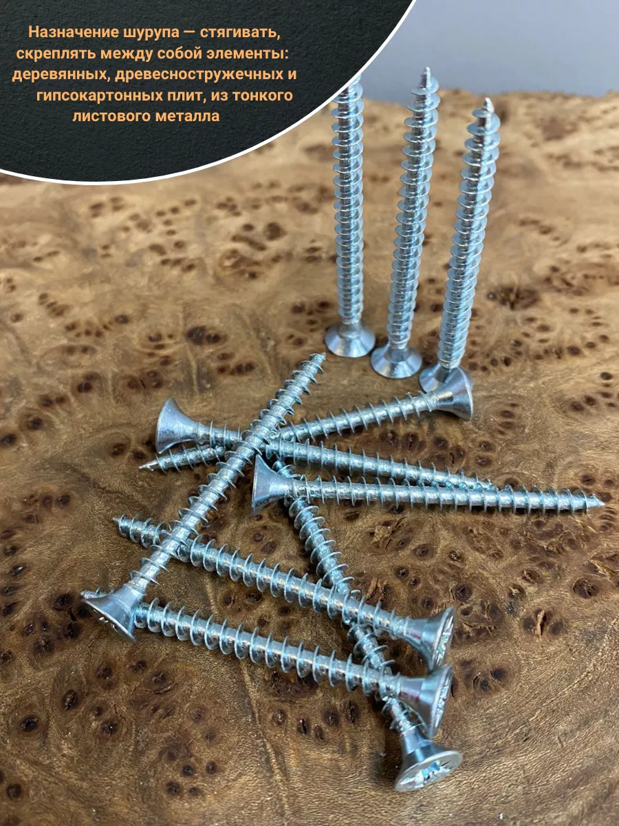Универсальные шурупы с потайной головкой изготовлены из углеродистой стали и закалены для придания твердости поверхности и сердцевины. Для снижения рисков развития коррозии на них на нанесено гальваническое цинковое покрытие с белой пассивацией, которое улучшает защитные свойства цинка и придает гладкий блестящий внешний вид.