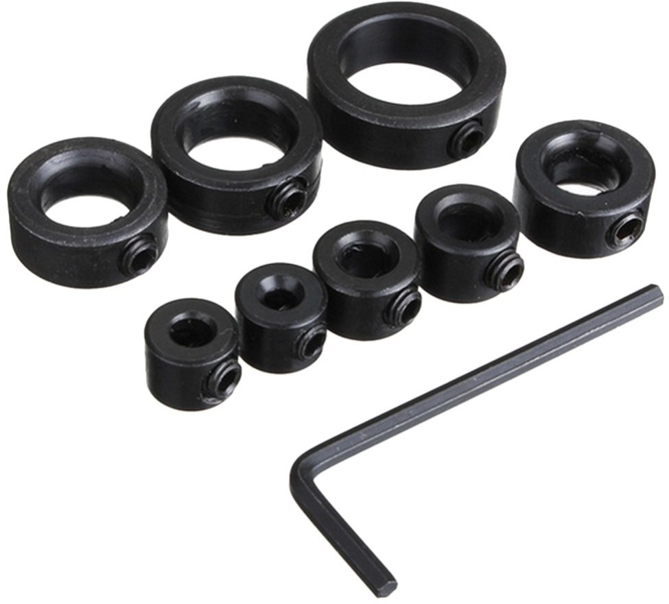 Стопперы для сверел, набор 6 шт. (3, 4, 5, 6, 8, 10 мм) с шестигранным ключом 2,5 мм в комплекте. Для ограничения глубины сверления. Материал: инструментальная сталь с черненым покрытием. Упаковка: блистер.