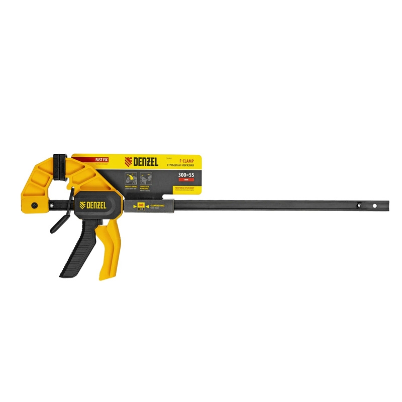 Струбцина F-образная быстрозажимная Denzel 20502 — это инструмент для надёжного фиксирования деталей при их обработке, склеивании и других работах. Ширина струбцины составляет 300 мм, глубина — 55 мм. Её нейлоновый корпус усилен, благодаря чему устойчив к ударам и падениям с небольшой высоты.